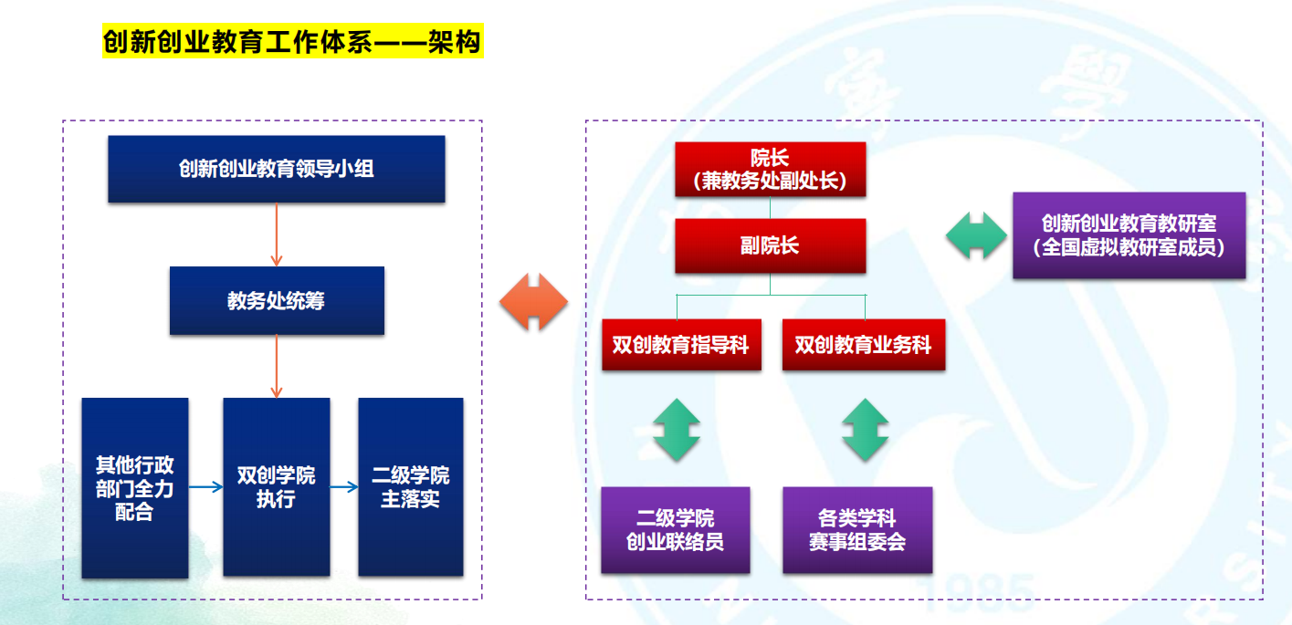 践行“产学研创就协同育人”理念,落实立德树人根本任务,以学生发展为中心,打造创新创业工作体系。2016年7月14日,创新创业学院正式授牌成立,由教务处统筹,创新创业教育学院执行,二级学院主落实,其他行政和教辅部门全力配合,全校各部门有机协同,形成工作合力。
