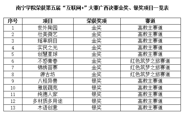 为了更好的备战校赛、挺进区赛,学校邀请到多位业内专家到校宣讲,校长赖每、党委书记刘彪、党委副书记覃存民、副校长陈雄章等校领导多次深入二级学院指导参赛工作。学校还多次举办大赛训练营、特训营等活动。参赛项目经过多次培训、指导,在商业计划书的撰写、PPT的制作、路演稿的讲解等方面均得到了提升,强化了参赛能力。历经了网评、会评、校赛、复活赛等阶段,学校共有14个项目进入了广西区总决赛,其中11个项目获争金保银、3个项目获得争银保铜的好成绩。最终荣获8个金奖、5个银奖、1个赛道冠军。同时,学校凭着组织有力、参赛项目多、项目质量高、比赛成绩优异,与广西大学、广西师范大学共同荣获高教赛道和红旅赛道双“优秀组织奖”。