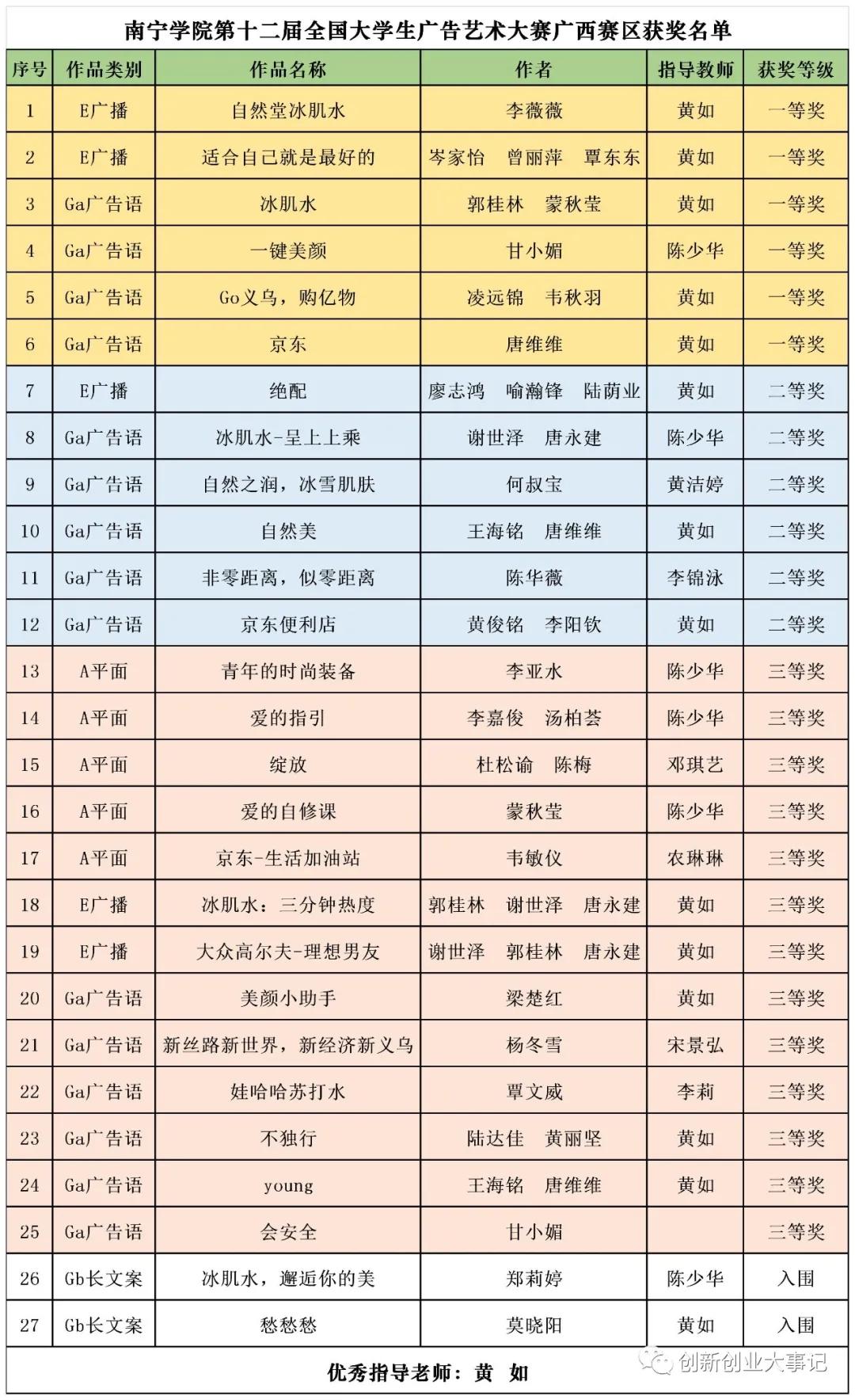 近日,第十二届全国广告艺术大赛广西赛区获奖名单已公布,qm球盟会获得一等奖6项、二等奖6项、三等奖13项以及入围奖2项,共计27项,黄如老师获优秀指导教师,为我校学科竞赛成绩又增添浓墨重彩的一笔。