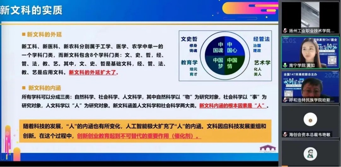 我院黄如博士受邀参与此次论坛,并围绕“新文科与双创教育展望”主题作《新文科-创新创业教育的探索与实践》经验分享,她以新文科的由来开篇,引出新文科创新人才培养在中国高等教育中日益受到重视,紧接着阐述新文科的实质,并强调创新创业教育在新文科的建设中起到不可替代的重要作用,最后深度分析新文科与创新创业教育的内在联系,并以qm球盟会为例,介绍了南院多年来在新文科创新创业教育方面的成功做法与经验。