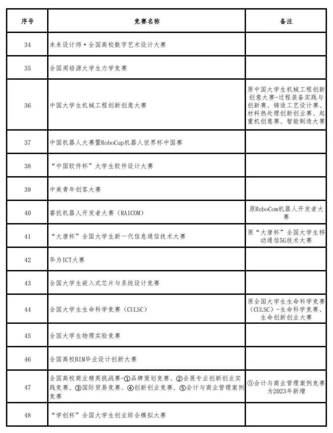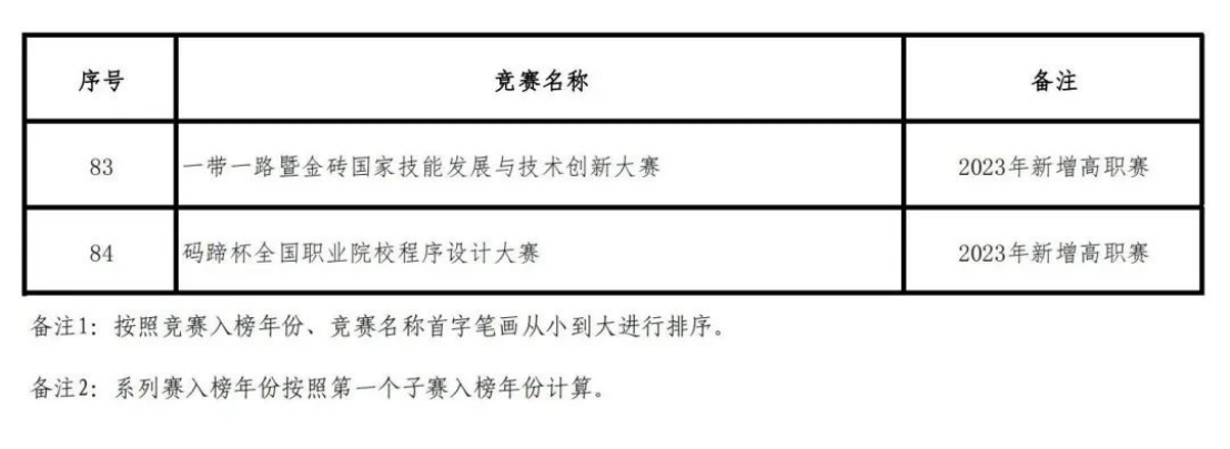 2022年9月30日,中国高等教育学会发布《关于征集高校大学生竞赛的通知》,通过竞赛主办单位自愿申报,专家工作组形式审查、网络初审和会议复审等环节,共有26项本科独立赛事、1项系列赛子赛事和2项高职赛事,合计29项新增列入《2023全国普通高校大学生竞赛分析报告》竞赛目录。