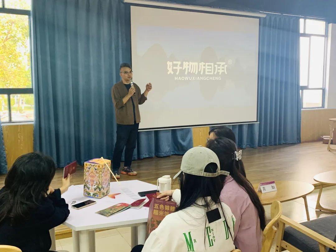 首先,陈老师从非遗产品传承初心、创新设计理念、商业模式、产品展示与制作等四个方面向在场的同学们进行分享。他提到:非遗产品要想得到更多年轻群体的关注,其推广路径可以从运用非遗产品和现代人的实用理念相结合,在保持产品初心的基础上,去掉那些已经被时代淘汰的部分,保留并发扬能够跟现代消费者发生情感和物质连接的部分,通过文创赋能,使产品商业化,构建一个传统工艺和现代市场之间良性的商业闭环,让大众从心底认同并接受非遗产品,并融入到日常生活中。