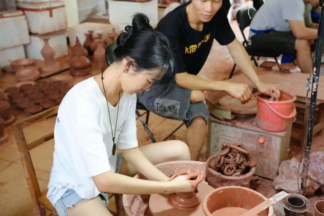 第一站同学们来到了钦州承坭斋陶艺工厂。广西钦州坭兴陶被誉为中国四大名陶之一,至今已有1300多年的传承历史,坭兴陶烧制技艺被列入国家级非物质文化遗产名录。钦州承坭斋陶艺工厂深耕坭兴陶文化产业的同时开展扶残助残工作,为残疾群体提供工作岗位和培训机会。同学们通过观察与体验,了解坭兴陶产品的多样化表现形式,结合残疾群体的工作特殊性,思考如何将文化与产品融合,用更新颖、更符合现代消费者心理的产品推动当地经济发展,帮助更多残疾群体获得平等就业的机会。