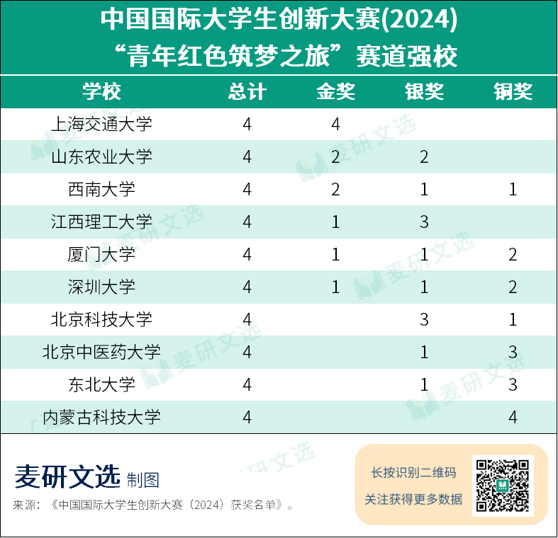 本届赛事中,共有上海交通大学、山东农业大学、西南大学等10所高校以斩获4个奖项并列“青年红色筑梦之旅”赛道获奖总数首位。