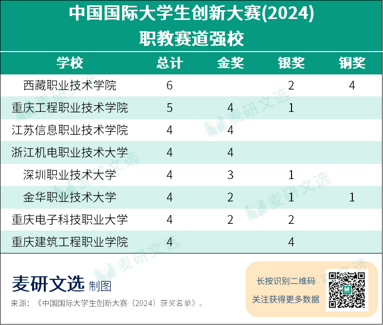 本届职教赛道获奖总数最多的是西藏职业技术学院,总计获得6个奖项,包括2项银奖、4项铜奖。