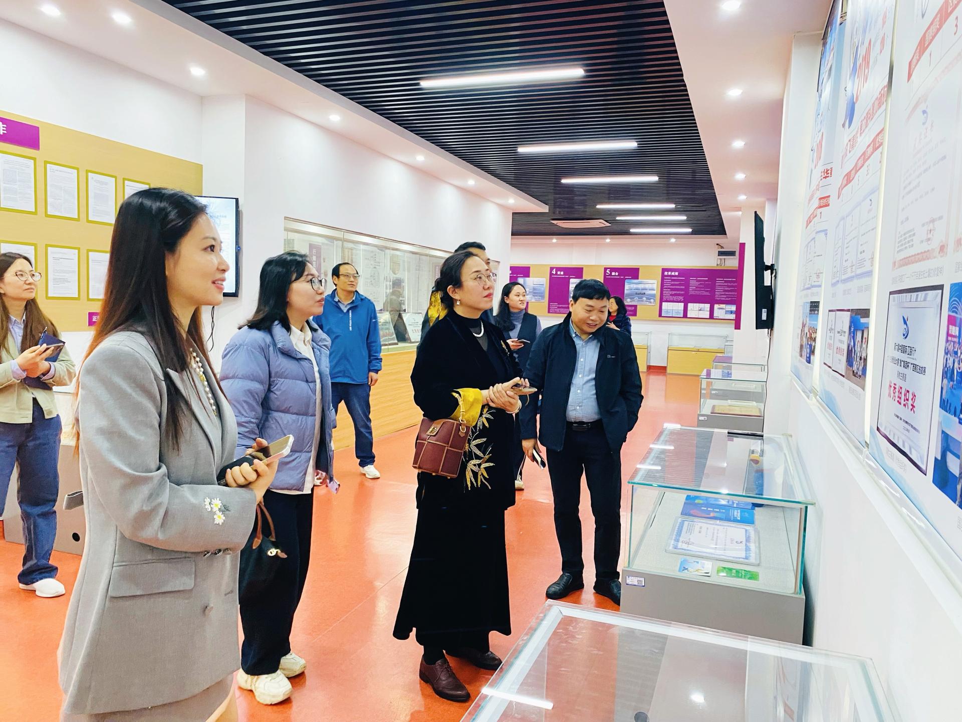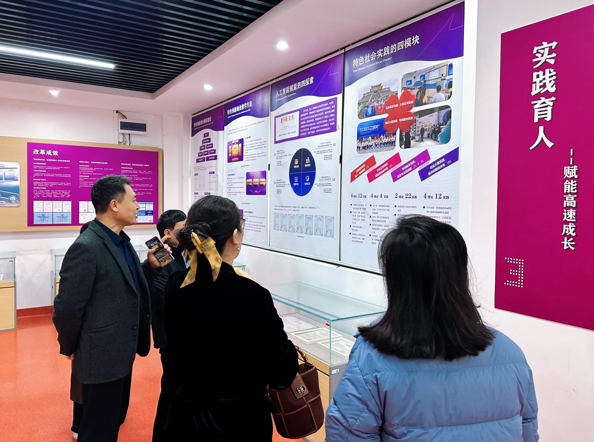 首先,韦良副院长一行前往qm球盟会创新创业成果展厅参观。解说员李梓昕引导大家依次参观“邕水敷文,庚续千年文脉”“行知范式,践行育人初心”“实践育人,赋能高速成长”“桃李芬芳,彰显最高荣耀”四个展区,详细讲解了我校创新创业教育的发展概况、改革举措及育人成效。