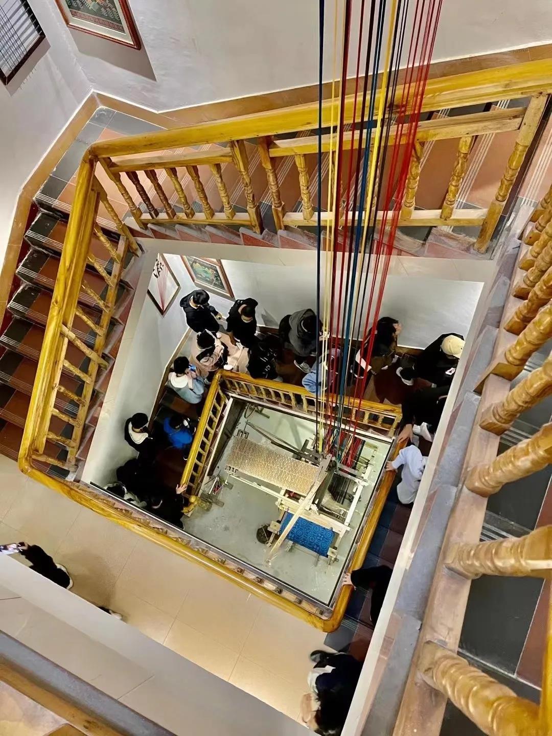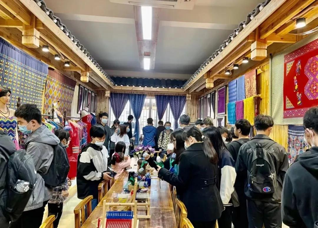 壮锦作为四大名锦之一,是壮族传统文化中具有代表性的瑰宝。最后一站同学们来到了湘光织锦坊,跟随着企业导师共同了解壮锦。