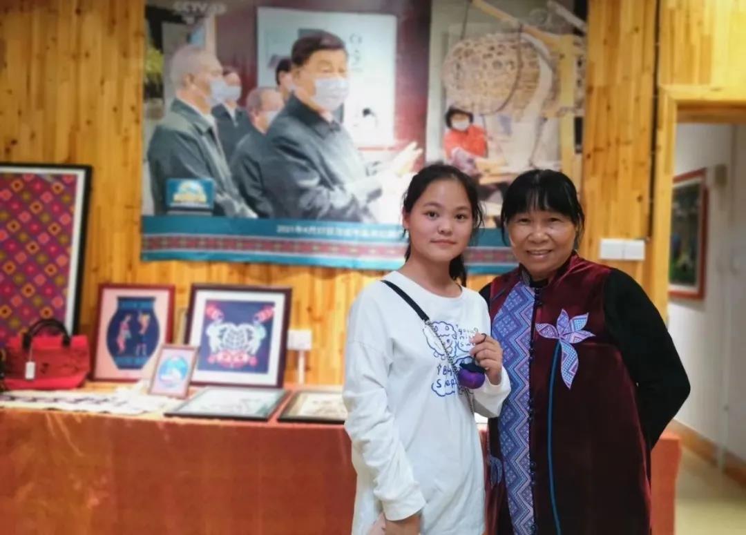 中国工艺美术大师、织锦工艺大师、广西非物质文化代表性传承人谭湘光大师亲临现场,为同学们介绍壮锦工艺知识。她对同学们的到来感到非常高兴,希望同学们了解民族文化,让更多的人了解壮锦,喜欢壮锦。同学们仔细欣赏着壮锦纹理,纷纷感叹传统手工匠人们的精湛技艺。