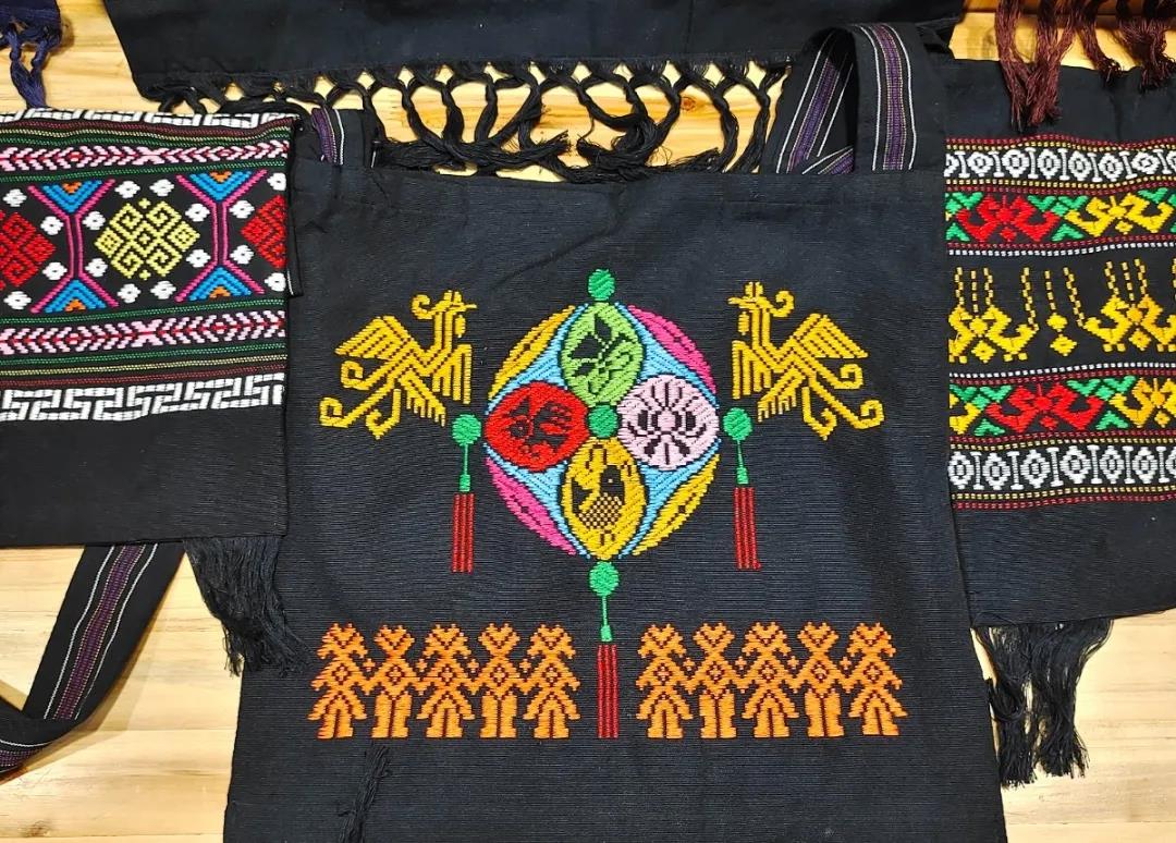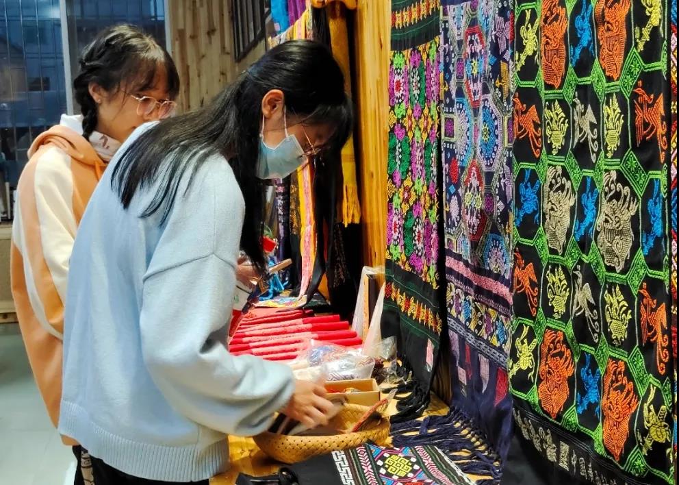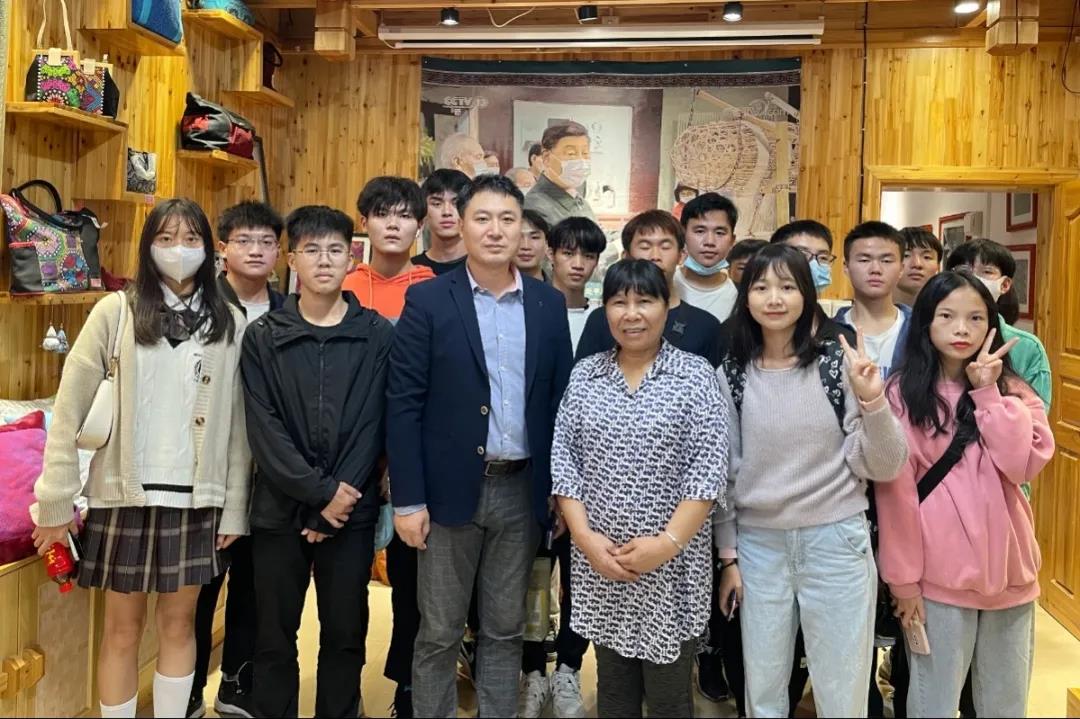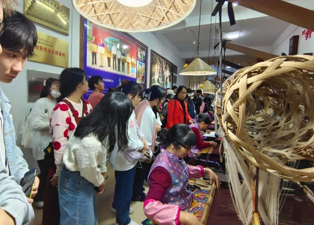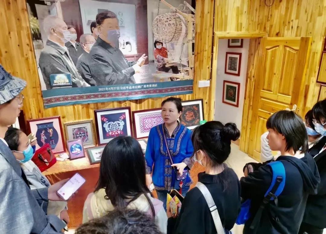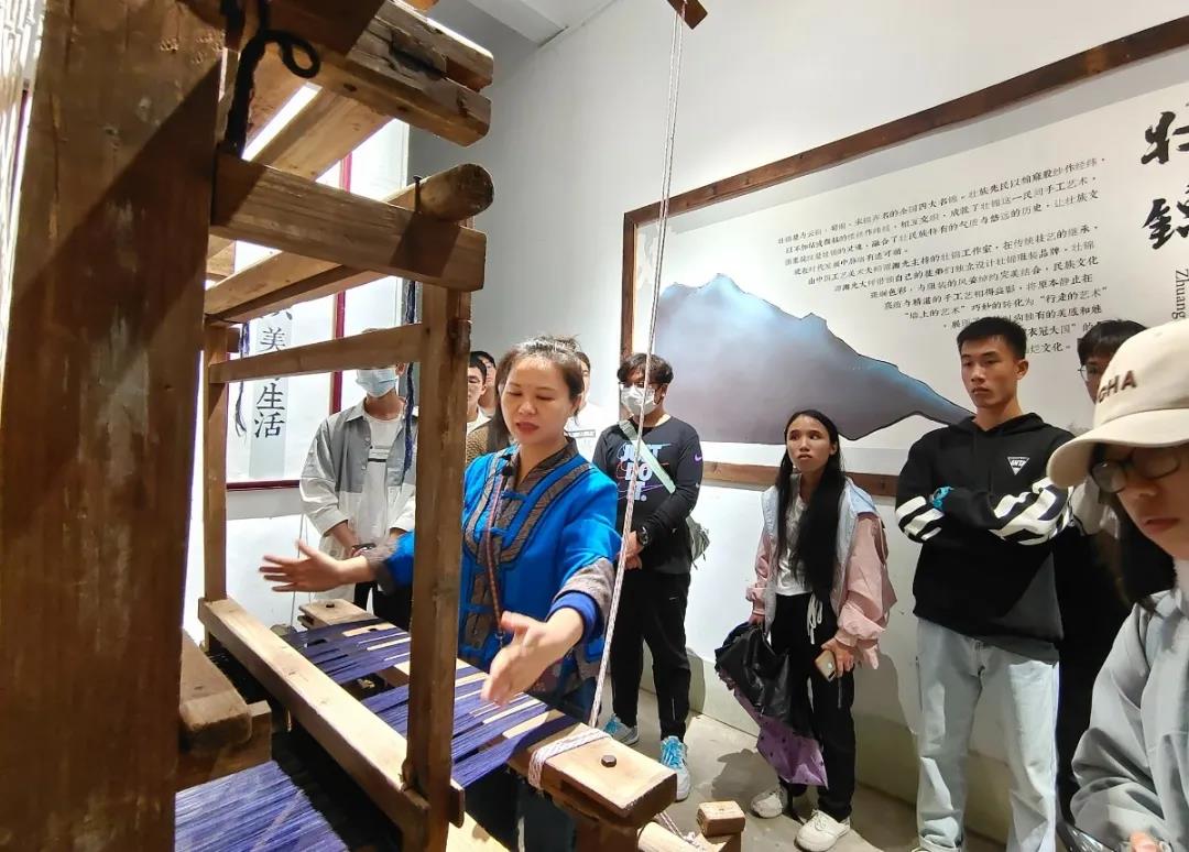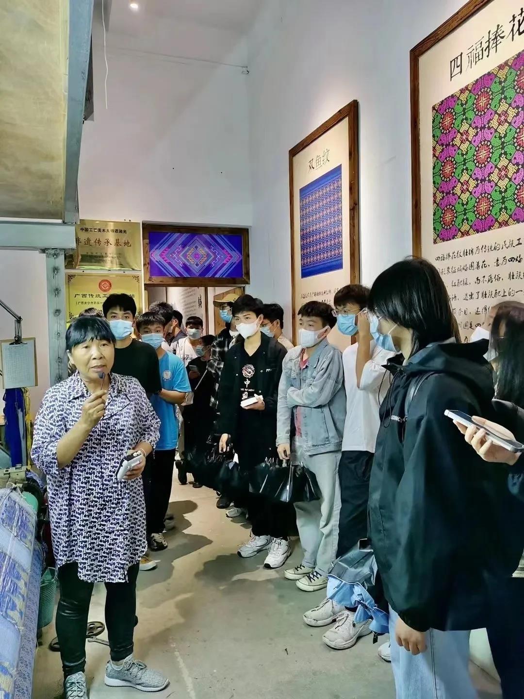 壮锦与云锦、蜀锦、宋锦并称中国四大名锦,中国壮族传统手工织锦,是中华民族文化瑰宝。最后一站是壮锦湘光纺织。无数条锦线在纺织机上悬挂,也被纺织工人无数次拨动。同学们认真聆听着中国中国工艺美术大师、织锦工艺大师、广西非物质文化代表性传承人谭湘光大师介绍普及壮锦知识,从一楼纺织机到二楼纺织工坊再到三楼壮锦展示厅,一丝一线皆为匠人之作。为打破壮锦“土气”的刻板印象,让更多的年轻人关注并爱上壮锦文化,织锦坊开发了很多时尚的壮锦元素单品,时尚的壮锦真皮包包、娇憨可爱的小牛公仔、精致小巧的耳环……这些工艺品全都融入了壮锦元素,传统精湛的技艺与现代美学的艺术设计相互碰撞出灿烂的火花。