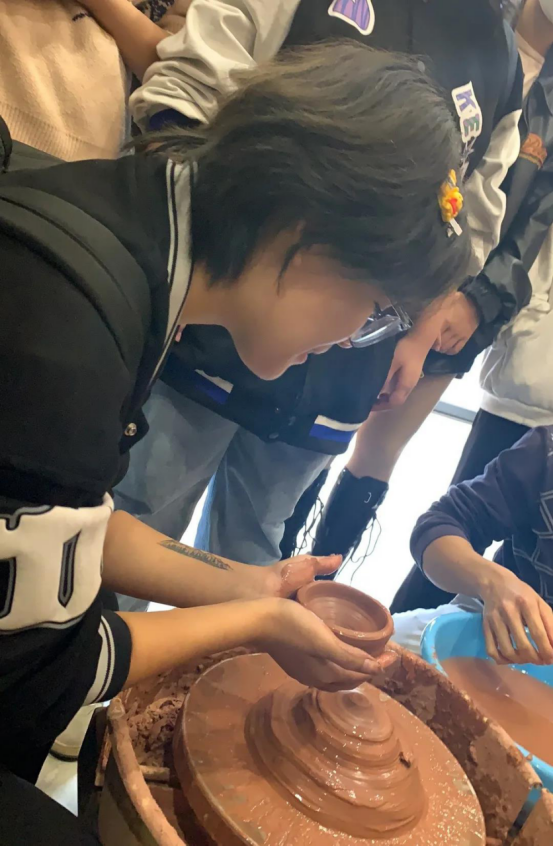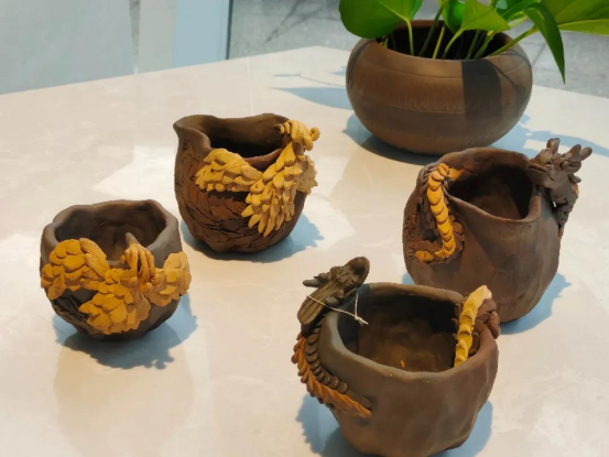 随后,利成世大师带领团队参观了坭兴陶小镇。小镇作为现代坭兴陶产业的代表性地点,坐落着众多工艺美术大师们的工作室。一件件精巧的坭兴陶文创产品,展现了大师们精湛的技艺,也体现了现代社会快速发展下的坭兴陶生生不息的生命力与可塑性。同学们走走看看,对坭兴陶产业现状有了初步的了解,部分同学亲手体验了坭兴陶制作过程。