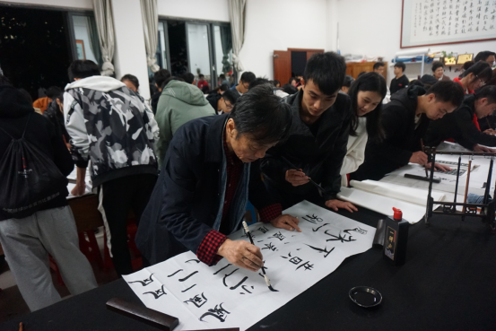 在讲座的前半部分,吴教授分别从书法入门、优秀作品展示、综合修养的重要性三个大的方面进行讲授。吴教授的精彩讲授获得了参与讲座的学生们阵阵掌声。讲座的后半部分,参与讲座的师生们移步到了学生活动中心一楼书画室进行书法写作实践。吴教授耐心地讲解如何握笔、如何下笔、如何在书写过程中修身养性等,并拿起毛笔为在场的师生做示范。随后,吴教授让老师和同学们自己动手实践,并在大家实践的过程中逐一进行指导和点评。吴教授的讲座通过理论与实践相结合方式来开展,让参加此次讲座的老师同学们受益匪浅。