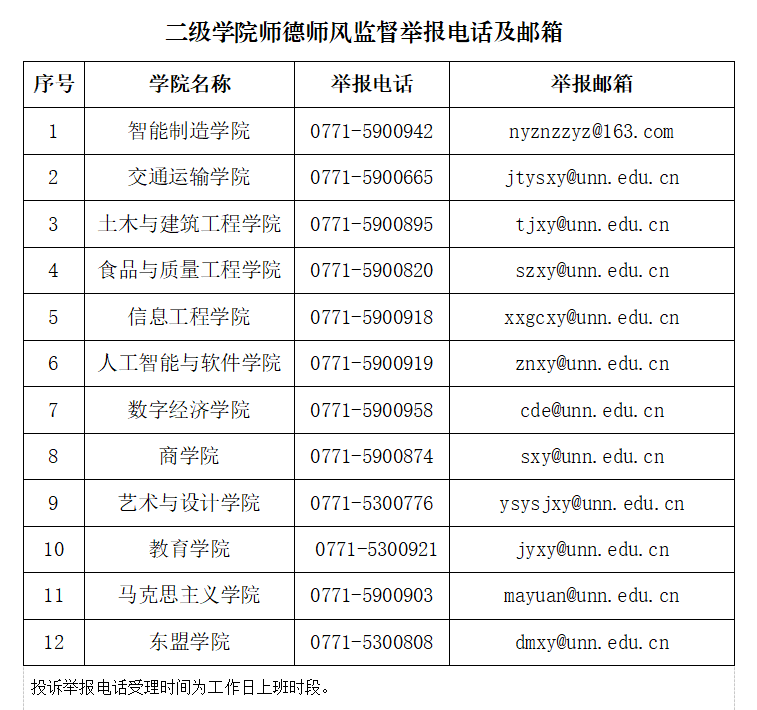 学校师德师风监督举报电话:0771-5900924;举报邮箱:jsgzb@unn.edu.cn。投诉举报请提供具体线索材料。