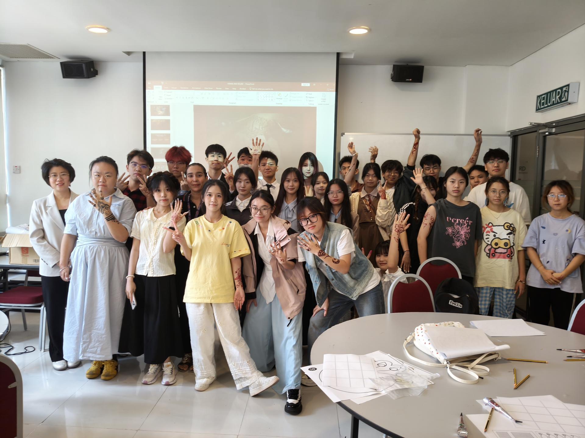 在开营仪式结束后的几天学习中,同学们依次参与了形式多样的马来西亚传统民俗体验课程。在马来西亚文化介绍课上,同学们了解马来西亚“多元共生”的族群文化;在基础马来语课程中,学习 “Terima kasih(谢谢)”“Selamat pagi(早上好)” 等实用表达;在蜡染工坊,大家在匠人的指导下,手持染料进行蜡染创作,亲身体验蜡染工艺;同学们还体验了印度米绘和手绘课程,在独自创作中感受印度民俗文化的独特韵味。