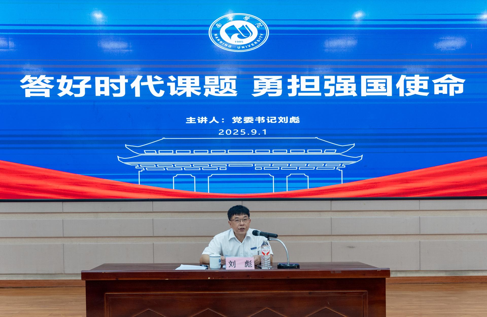 学校党委书记刘彪以“答好时代课题 勇担强国使命”为主题,为新生讲授“开学第一课”。他围绕“如何理解好时代的科学内涵”“如何把握好青春的发展机遇”“如何领悟好新时代大学生应具备的素质与发展要求”三个问题,从新时代的鲜明主题、战略安排、价值追求、历史使命和世界担当等五个方面展开解读,引导学生认清国家发展新方位,找准人生坐标。刘书记还通过一系列英雄事迹与模范案例,勉励新生从榜样中汲取前行力量,立大志、明大德、成大才、担大任,勇毅回应时代课题,自觉担当强国建设、民族复兴伟大使命。