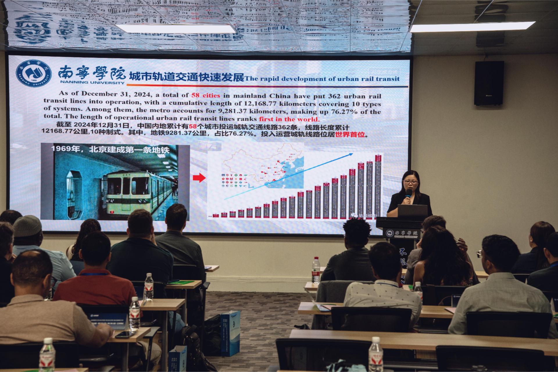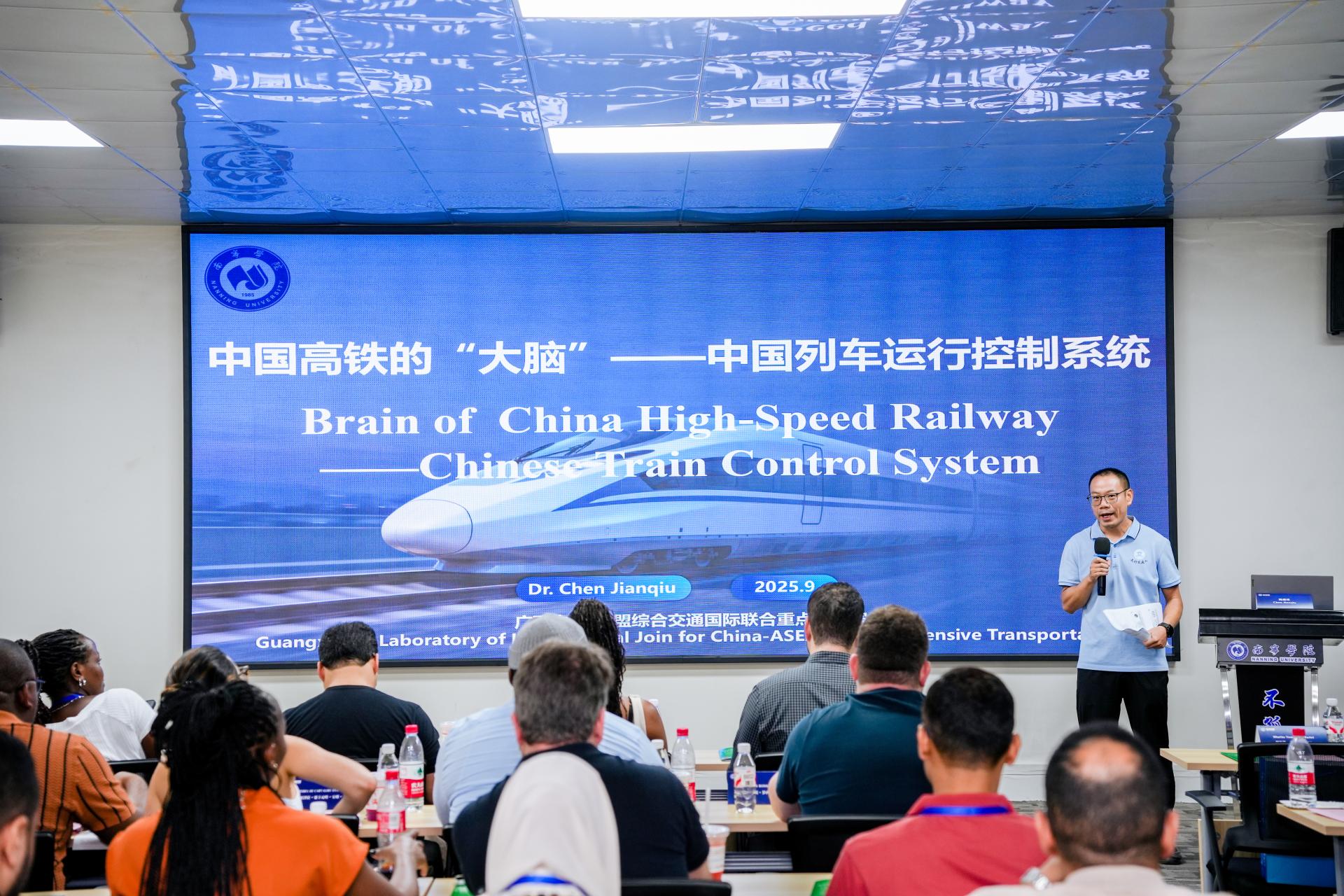 随后,交通运输学院副院长庞彦知教授以《城市轨道交通前沿技术》为题,解析城市轨道交通的创新发展方向;广西中国-东盟综合交通国际联合重点实验室副主任陈建球教授则聚焦《中国高铁的 “大脑”——中国列车运行控制系统》,深入介绍中国高铁技术的核心突破,为学员带来前沿且务实的专业分享。