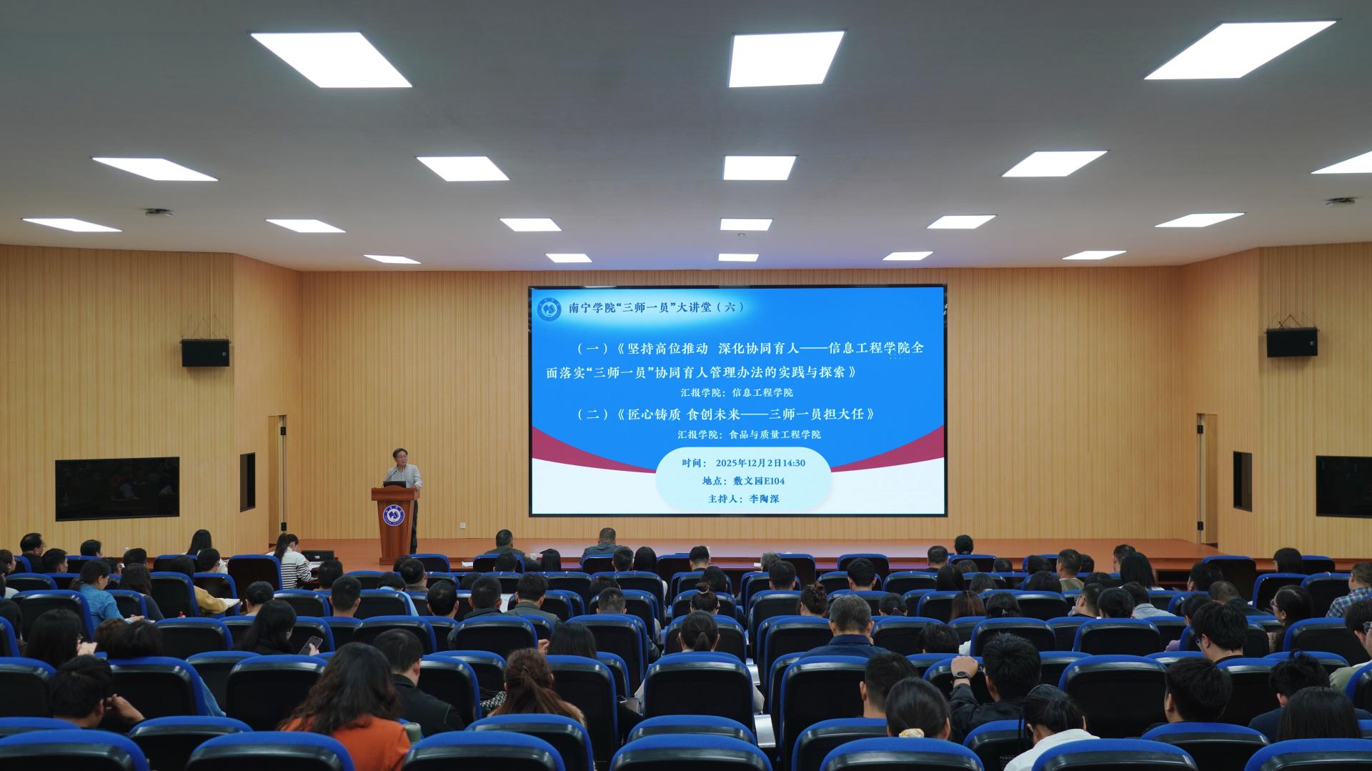 为贯彻落实立德树人根本任务,以协同创新探索育人新路径,12月2日,qm球盟会“三师一员”大讲堂第六讲精彩开讲。本次活动以案例为镜、以研讨为径,旨在通过案例研讨,凝练育人新范式,汇聚协同新智慧,为学校“三全育人”综合改革与高质量发展注入新动能。讲座由学校副校长李陶深主持,特邀信息工程学院、食品与质量工程学院进行专题分享,校领导班子、各职能部门与二级学院负责人及教师代表共同参与。