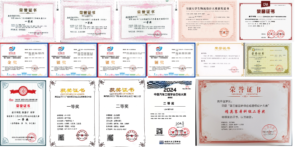 以赛促学,激发创新活力。学院推行“课赛结合、专创融合”,学生工程实践与创新能力显著提升。“十四五”期间,学生在一至三类学科竞赛中共获奖45项,其中国家级4项。在中国国际大学生创新大赛中斩获国赛1银3铜、区赛7金12银11铜的佳绩。