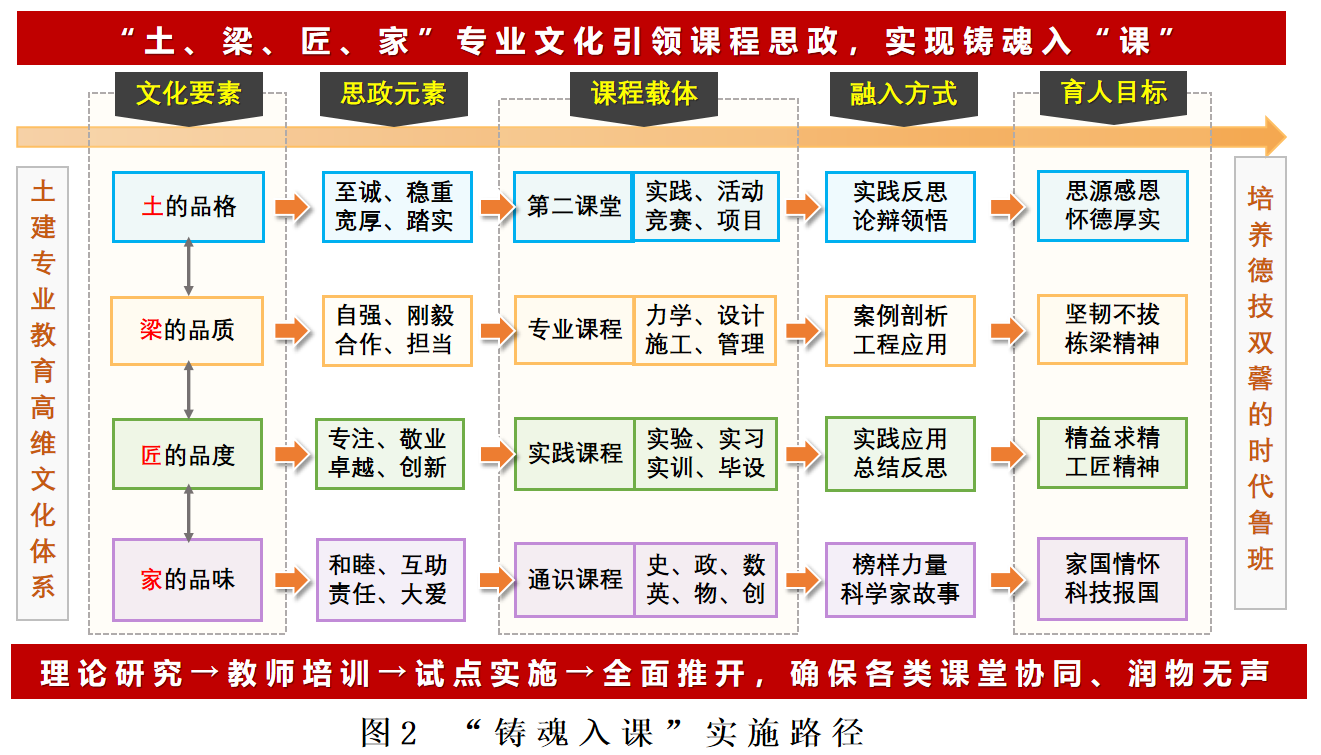 (一)文化铸魂。将学院文化“土、梁、匠、家”融入课程思政,以文化之力铸就育人硕果,彰显“铸魂入课、德技双馨”的育人担当。