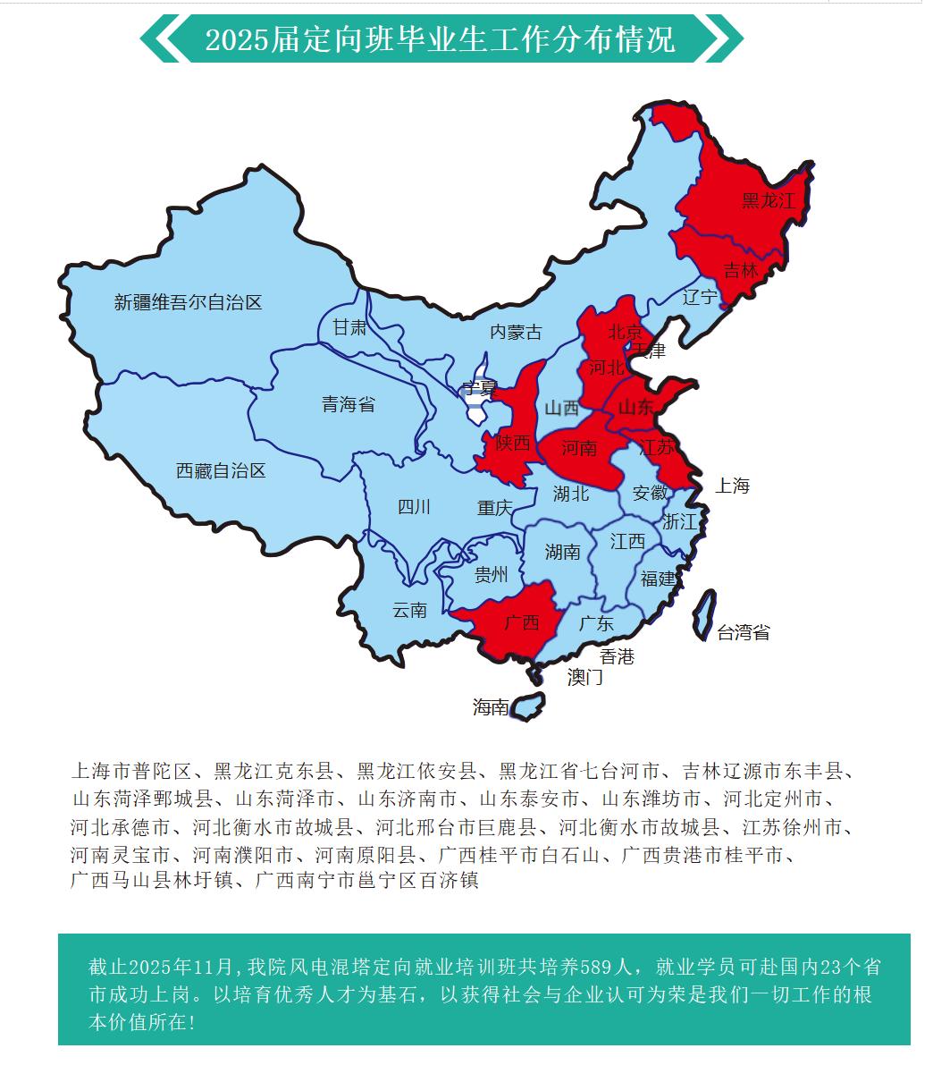 一)定向赋能直达岗位践行三维协同就业育人理念,行业需求导向与专业教育同步——认识岗位;企业标准融入与实践教学同步——站上岗位;职业能力培养与就业育人同步——站稳岗位。2024年开设“风电混塔定向分配就业培训班”以来,累计培养学员589人,2025届107名毕业生被定向企业录用,截至2025年11月24日,2026届定向班学员已就业83人。