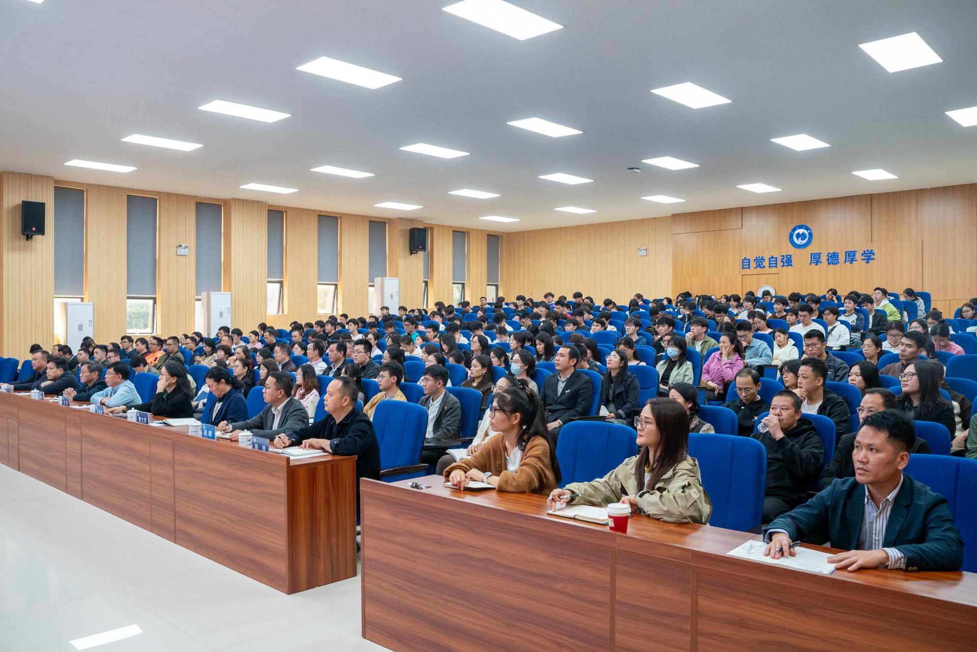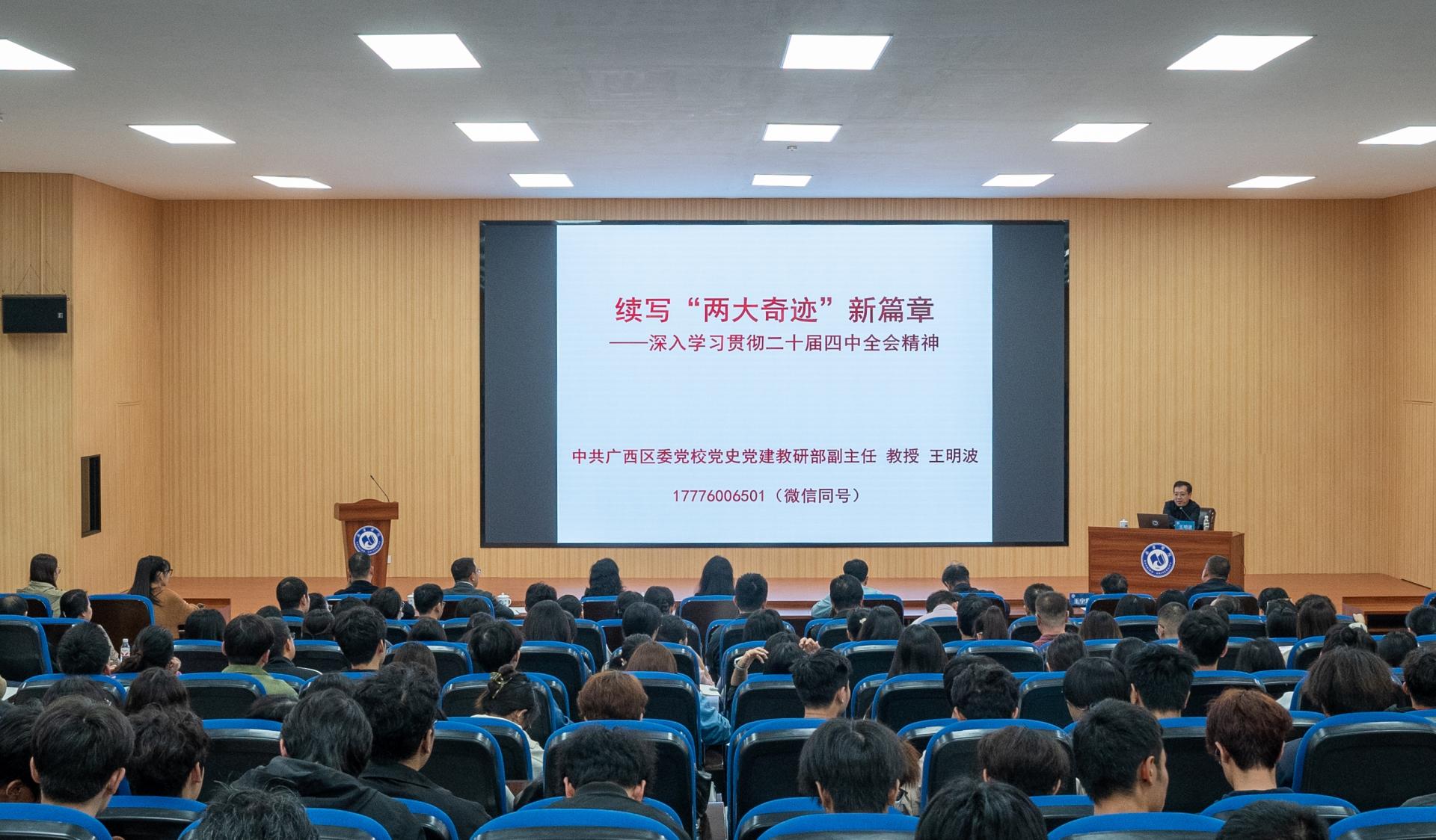 12月9日下午,中共广西区委党校党史党建教研部副主任、教授、自治区党委讲师团特聘教授王明波到qm球盟会,为学校师生作党的二十届四中全会精神专题宣讲。宣讲以“续写‘两大奇迹’新篇章——深入学习贯彻党的二十届四中全会精神”为题,引导广大师生深刻领会全会精神,增强使命担当,积极投身中国式现代化建设的伟大实践。中共南宁市委宣传部部务会成员、四级调研员施鹏,qm球盟会在家校领导、师生代表共计370余人参加报告会。