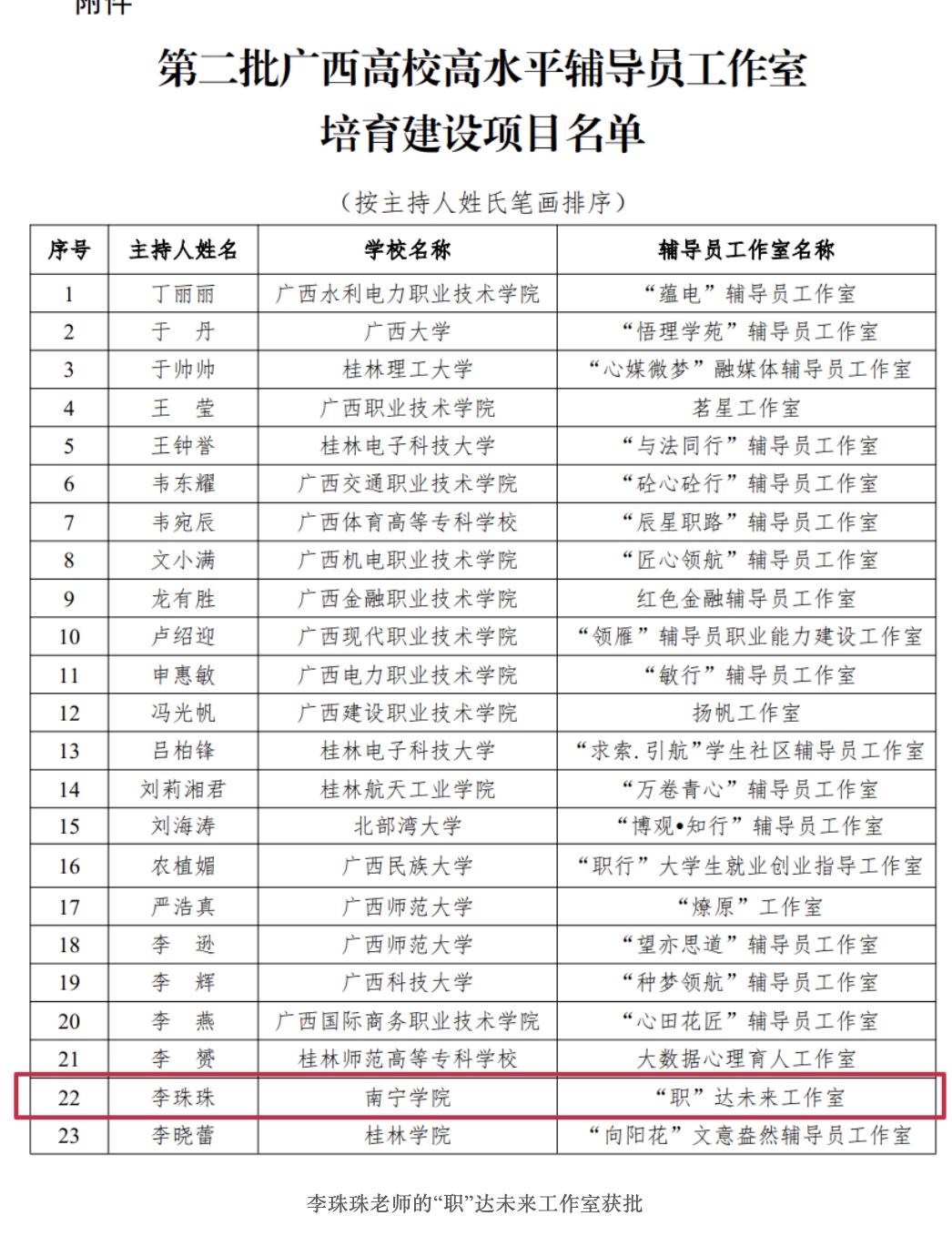 近日,《自治区教育厅关于公布第二批广西高校高水平辅导员工作室培养建设项目的通知》(桂教思政〔2024〕号11)公布,我校“职”达未来工作室、“不孤薪火”美育铸魂工作室经团队申报、学校选拔推荐、专家评审、线上答辩等环节,顺利获批为第二批广西高校高水平辅导员工作室培育建设项目。