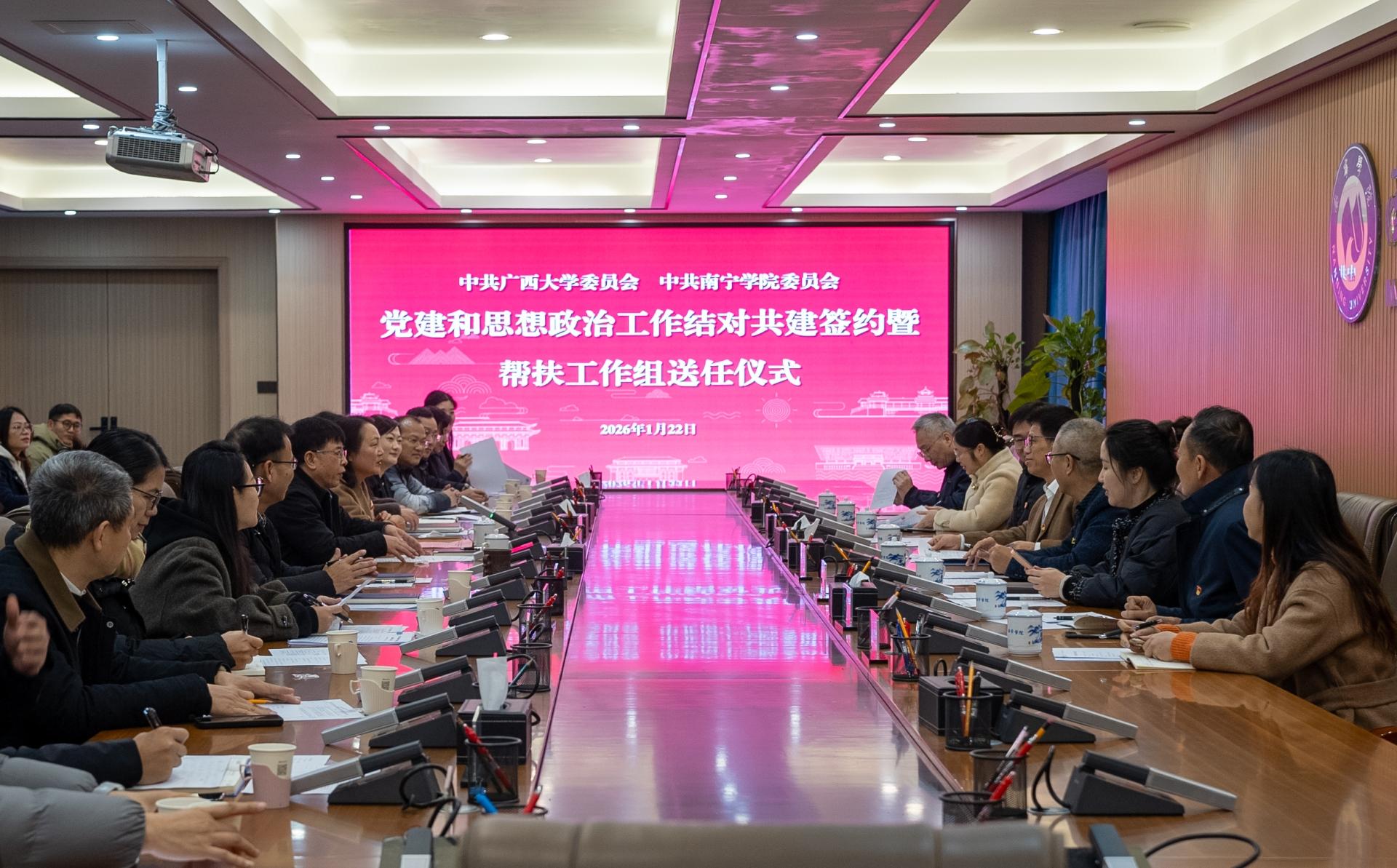 为贯彻落实《广西公办高校与民办高校党建和思想政治工作结对共建实施方案(2025—2028年)》文件精神,推动党建与思想政治工作高质量发展,2026年1月22日,广西大学党委与qm球盟会党委党建和思想政治工作结对共建签约暨帮扶工作组送任仪式在qm球盟会隆重举行。广西大学党委副书记宁旭初、相关部门负责同志、帮扶工作组组员一行8人,qm球盟会党委书记、副校长刘彪、党委副书记、副校长韦粤桂、相关部门、二级学院党组织负责人共同出席仪式。仪式由韦粤桂主持。