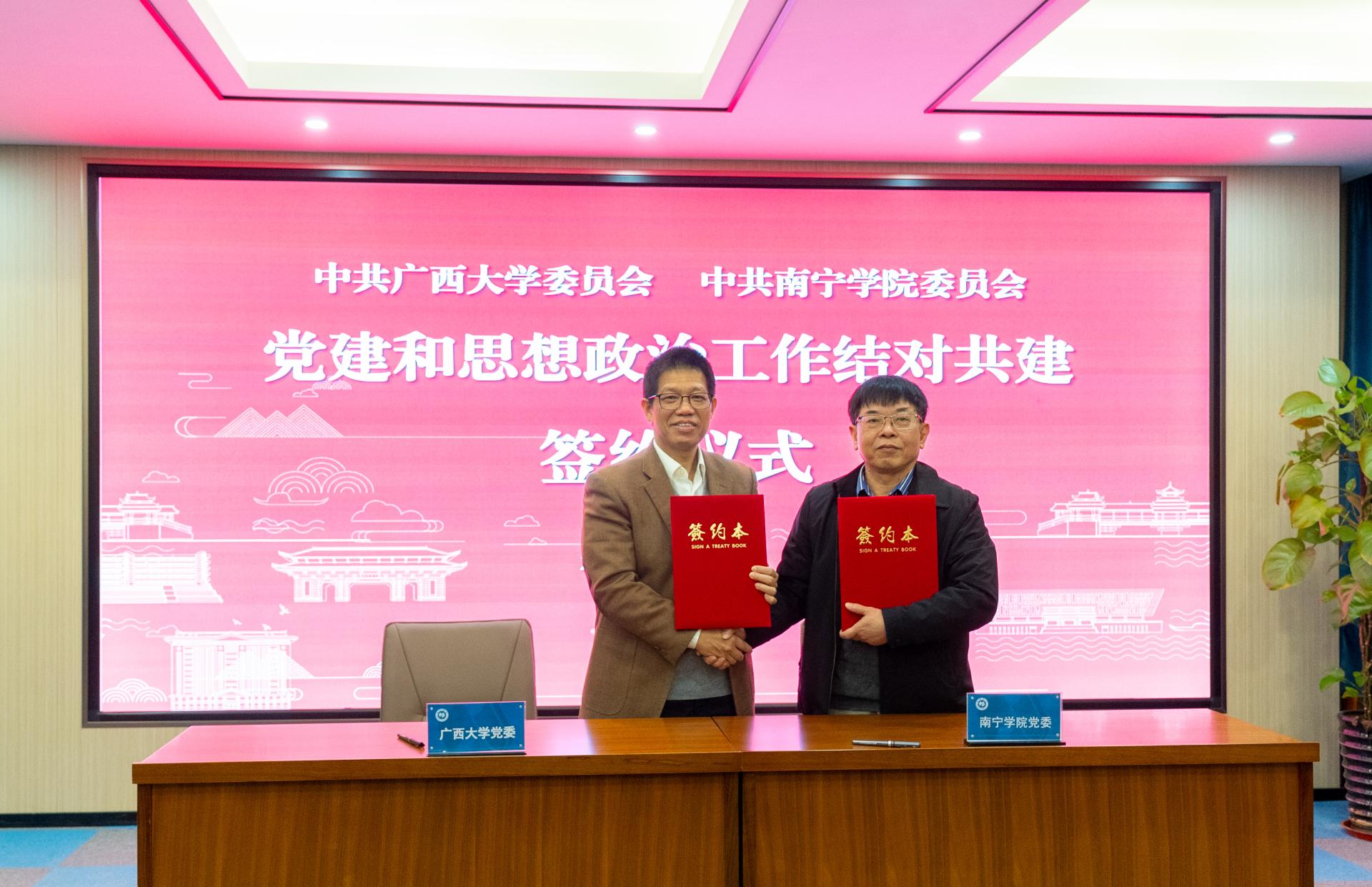 在全场与会人员的共同见证下,广西大学党委副书记宁旭初与qm球盟会党委书记刘彪正式签订党建和思想政治工作结对共建协议,标志着双方合作正式启动。