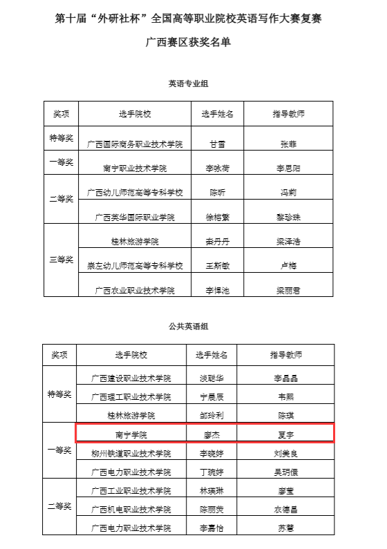 【喜讯】qm球盟会学子获“外研社杯”全国高等职业院校英语写作大广西赛区复赛一等奖