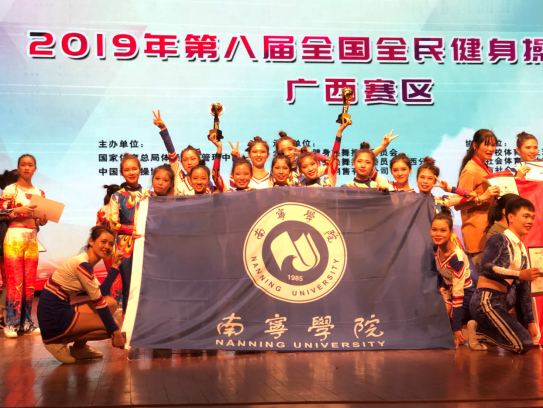 2019年11月15日-17日,由国家体育总局体操运动管理中心、中国健美操协会、南宁市体育总会主办的2019年第八届全国全民健身操舞大赛广西区赛,在广西财经学院举行。由学校通识教育学院体育教研室派出的健美操、啦啦操代表队,经历拼搏与努力,力敌各大强队,最终取得大学乙组《大众锻炼标准规定动作》特等奖、自选运动舞蹈特等奖的好成绩,指导教师唐雨、龚敏、杨凯茵均获“优秀教练员”荣誉称号。