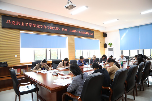 为加强全面学习宣传贯彻党的十九届四中全会精神,深入扎实推进“不忘初心 牢记使命”主题教育,11月25日上午,校党委书记刘彪在行政楼514讲授党的十九届四中全会精神专题党课并参加马克思主义学院党支部“不忘初心 牢记使命”主题教育组织生活会。会议由马克思主义学院党支部书记莫河东主持,马院全体党员参加学习。