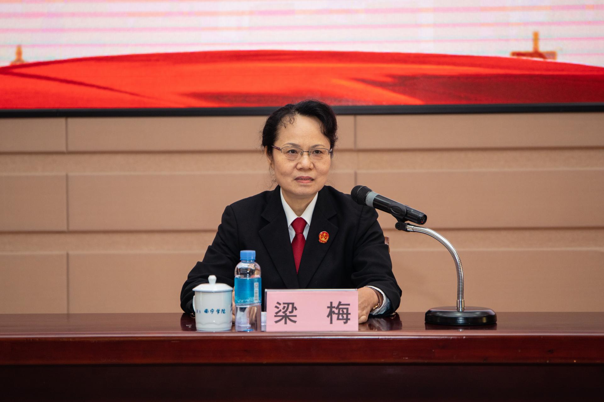 2019年12月4日是第六个国家宪法日,自治区高级人民法院副院长梁梅率高院、基层法院优秀法官走进qm球盟会,在学校图书馆报告厅开展极富意义的法治教育授课活动。校党委书记刘彪,校党委副书记、纪委书记覃存民,党委委员、副校长龚击,各党群部门负责人,马克思主义学院院长、副院长,各二级学院党总支书记、副书记,全体辅导员、思政课教师代表及学生代表共600余人参加活动。活动由覃存民副书记主持。