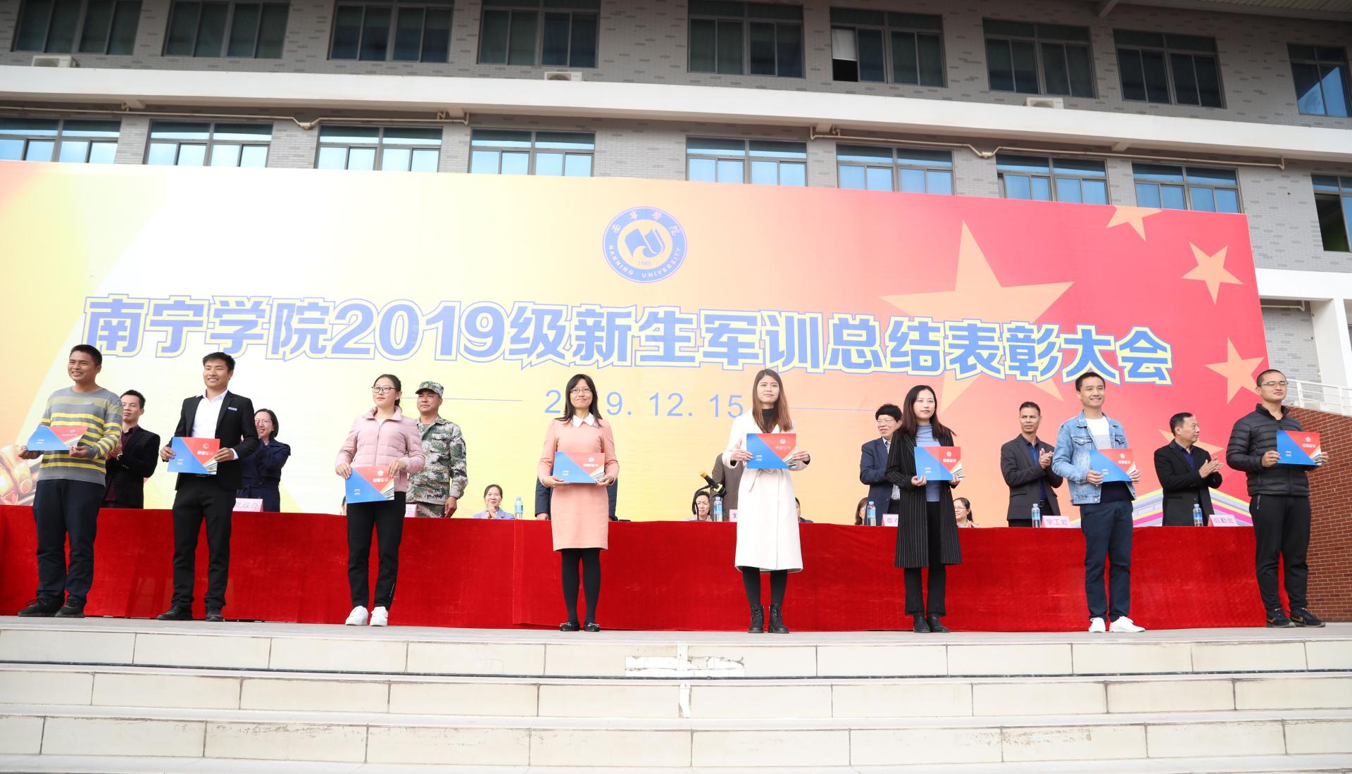 整齐划一、步伐铿锵的分列式军事训练及训练有素、精神抖擞的军事主题表演,充分体现了同学们刻苦训练的成果,彰显了南院学子的飒爽英姿。在为期14天的军训期间,涌现出了一批优秀集体和优秀个人。为表彰先进,会上对2个军训先进营、28个军训内务标兵宿舍、202名军训优秀学员、16优秀教官、16名军训先进工作者等先进集体及先进个人进行了表彰,主席台领导为分别为获奖集体及个人颁发荣誉证书。