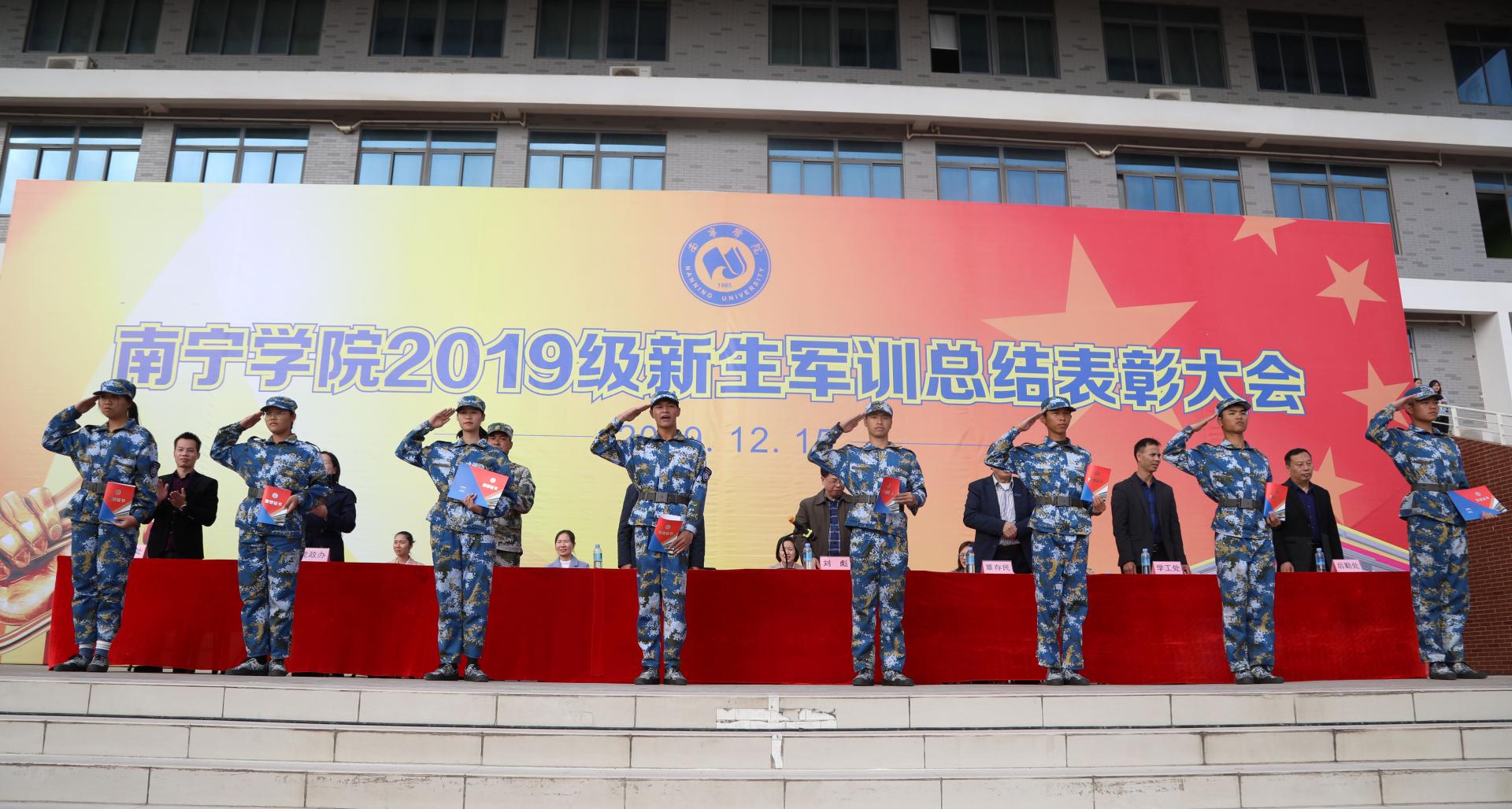 初冬南院,暖阳高照。12月15日上午,学校2019级新生军训总结表彰大会在田径场举行。校长赖每,校党委副书记、纪委书记覃存民,军训工作领导小组成员及广西三军联创祺诚军训基地主任钟友平出席大会。各二级学院学工科科长、新生班辅导员,全体教官及参训新生参加大会。大会由校党委书记刘彪主持。