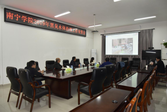 首先由基建工作人员对学校目前的黑臭水体治理情况进行详细汇报。11月21日,南宁市水环境综合治理工作指挥部技术组、邕宁区住建局及威宁集团到学校督导黑臭水体治理的整改工作,主要是雨污管道混排的问题,在学校相关工作人的陪同下进行现场勘查后确定了需要整改的点位。针对这些点位,汇报人员也提出详细的整改方案。