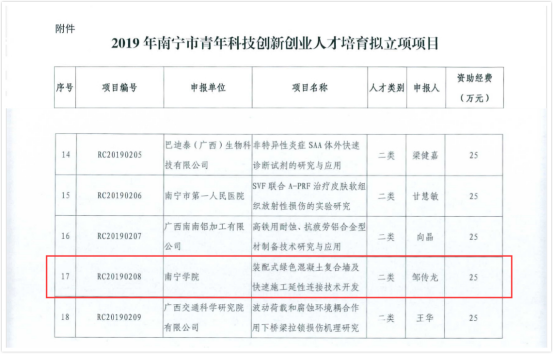 近日,南宁市科学技术局发布关于2019年南宁市优秀青年科技创新创业人才培育项目文件通知,共有18项项目(课题)获得立项,科技拨款共675万元。qm球盟会教师邹传龙申报的《装配式绿色混凝土复合墙及快速施工延性连接技术开发》获得二类人才立项,立项资助经费25万元。
