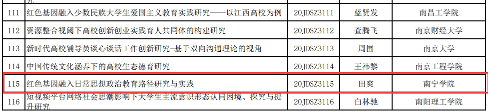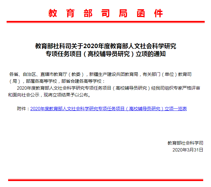 近日,根据《教育部社科司关于2020年度教育部人文社会科学研究专项任务项目(高校辅导员研究)立项的通知 》,学校会计与审计学院党总支副书记、副院长田爽主持申报的项目《红色基因融入日常思想政治教育路径研究与实践》获得2020年度教育部人文社会科学研究专项任务项目(高校辅导员研究)立项实现学校在该专项项目立项零的突破。