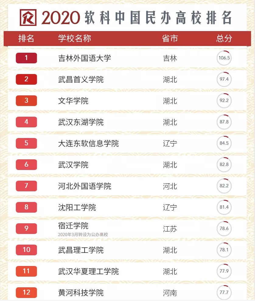 2020软科中国大学排名覆盖1205所本科层次的高校,其中公办大学806所、民办高校156所、独立学院237所、中外合作办学及内地与港澳台地区合作办学6所。本年度软科中国大学排名首次设置了1个主榜(综合性大学排名)、6个单科性大学排名、3个非公办大学排名,以及艺术类高校名单,1205所高校根据学校性质和学校类型被分别纳入到其中一个对应的排名或名单中。我校列入2020软科中国民办高校排名榜单。