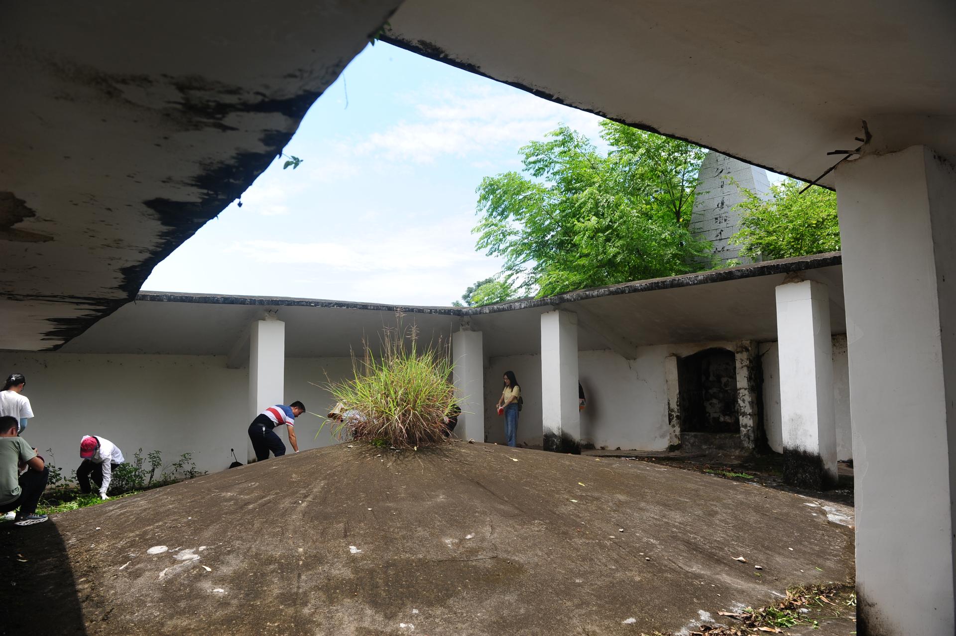 沙子村抗日烈士纪念亭也并不好找,一方面关于该纪念亭相关资料的网络记载不多,另一方面,一些文献所记载的位置在地图上却找不到。基于陈雄章教授对方位的判断和情怀使然确定了纪念亭的位置,穿过野草丛林寻到了隐藏在树林中的黄色房子——沙子村抗日烈士纪念亭,具体位置是宾州镇沙子村皇恋岭。沙子村抗日烈士纪念亭坐南朝北,系中华桂南抗战阵亡将士公墓,主要由三部分组成,即前广场、纪念亭主体建筑(一层,可上屋顶)、烈士墓(含回廊),总占地面积500平方米左右。由于知晓沙子村抗日烈士纪念亭的人不多,来祭拜的人亦少,因此,沙子村抗日烈士纪念亭各个角落长满了野草或树藤。调研组特意买来镰刀等工具,为烈士们打扫房间,剪除杂草,营造哪怕片刻的整洁、舒适。