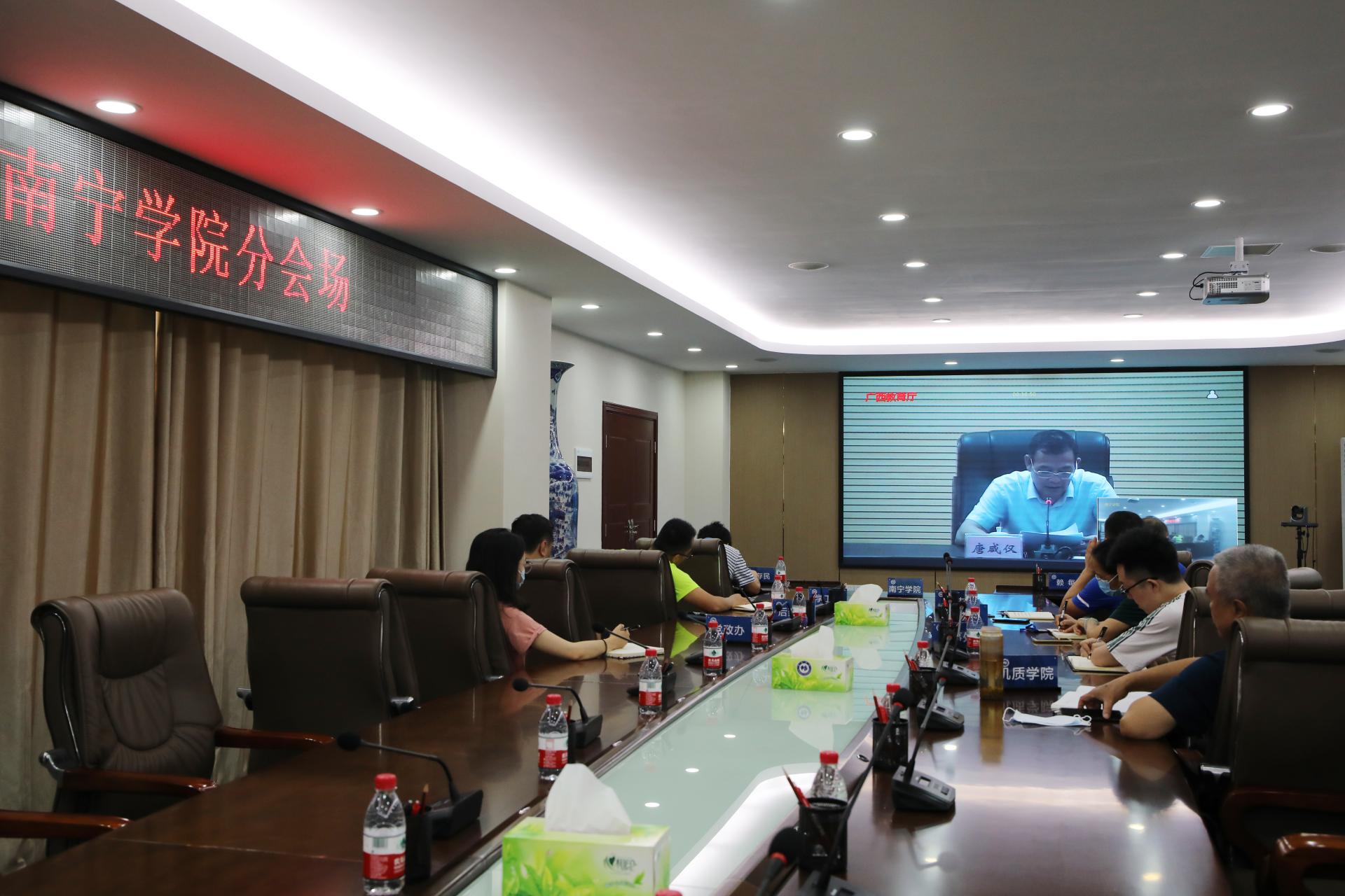 学校在行政楼三楼322视频会议室设立分会场,校长赖每,党委副书记、纪委书记覃存民,副校长龚击,教务处、学工处、人事处、后勤处相关部门和广西质量技术工程学校负责人在分会场参加会议。
