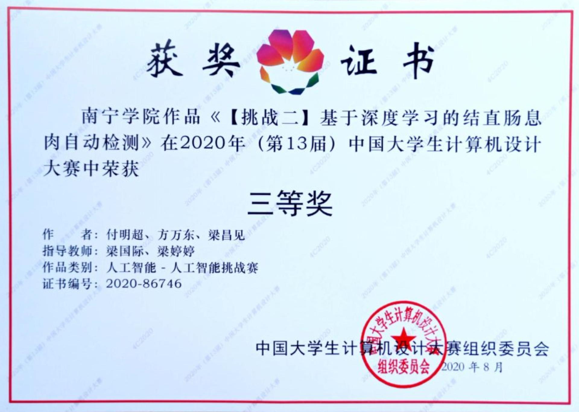 在日前结束的2020年(第13届)中国大学生计算机设计大赛中,qm球盟会信息工程学院梁婷婷、霍思聪、梁国际三位老师指导的《基于GEP算法的新冠病毒感染预测模型》、《基于深度学习的结直肠息肉自动检测》两个项目获得该赛事人工智能挑战赛全国决赛三等奖。