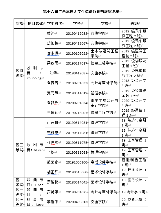 广西高校大学生英语戏剧节创办于2005年,每年举行一次,是广西高校规格最高、影响力最大的英语戏剧类比赛,是检验广西高校大学英语教学水平与大学生英语应用能力的重要盛会。为指导学生做好参赛工作,通识教育学院大学外语教研室于九月份专门组建教师团队,指导学生参与剧本创作、拍摄与剪辑等制作过程,并举办了第二届校园英文歌曲大赛,从获奖选手中选派学生录制视频参加自治区区决赛。本届比赛共有包括广西大学、广西师范大学、广西医科大学在内的全区40余所本、专科院校参加。面对来自多所高校的竞争,学校学生勤学苦练,认真备赛,终于不负众望,取得了优异的成绩,在高校外语届的赛事中赢得了一席之地,为学校争得了荣誉。