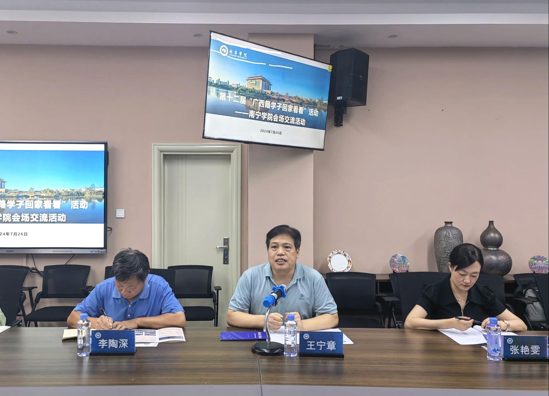 7月26日下午,根据南宁市委组织部、市委宣传部等单位主办的第十二届“广西籍学子回家看看”活动安排,在南宁北部湾人才金港有限公司副总经理魏娜带队下,广西籍博士生代表团共19人到我校参观交流。交流座谈会在综合楼111会议室举行,副校长李陶深、副校长王宁章及人事处、科研与学科建设处、智能制造学院、交通运输学院、商学院等单位负责人出席座谈会。会议由王宁章副校长主持。