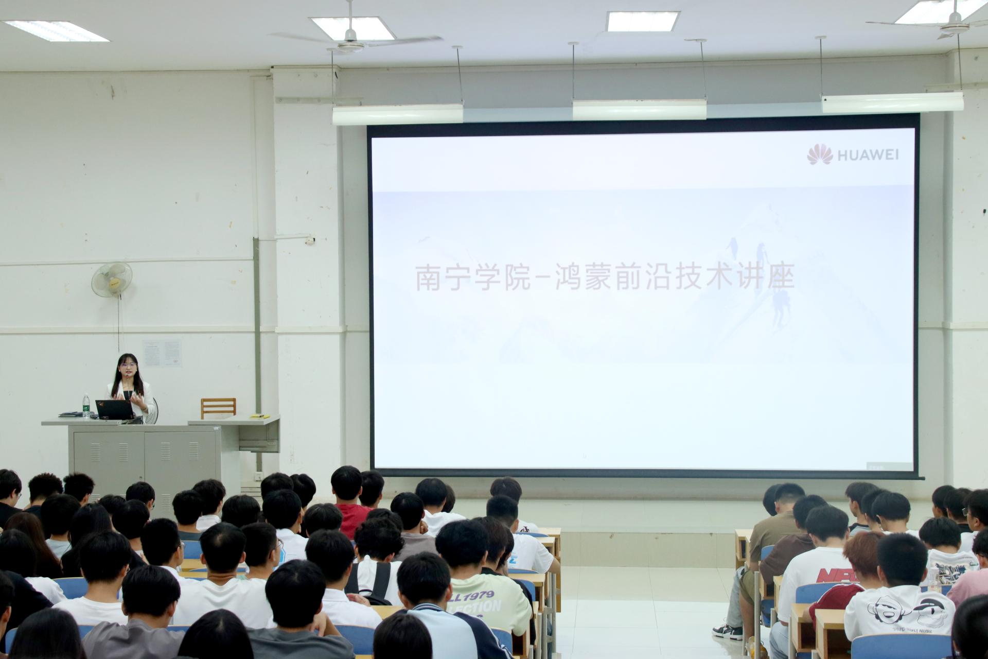 为了让同学们对华为鸿蒙前沿技术和未来职业发展有更加清晰的认知,10月17日晚上,qm球盟会与华为合作的开学季公开课系列之华为鸿蒙前沿技术介绍暨职业发展规划讲座在敷文园E-104顺利举行。本次讲座由我校华为数字技术产业学院主导,人工智能与软件学院牵头,与信息工程学院联合组织,旨在帮助相关专业学生深入了解华为鸿蒙前沿技术为学生的职业发展规划指明方向。讲座邀请华为全球培训中心资深鸿蒙应用开发讲师冯林娅老师作主题宣讲,现场吸引了350余名师生到场参加。