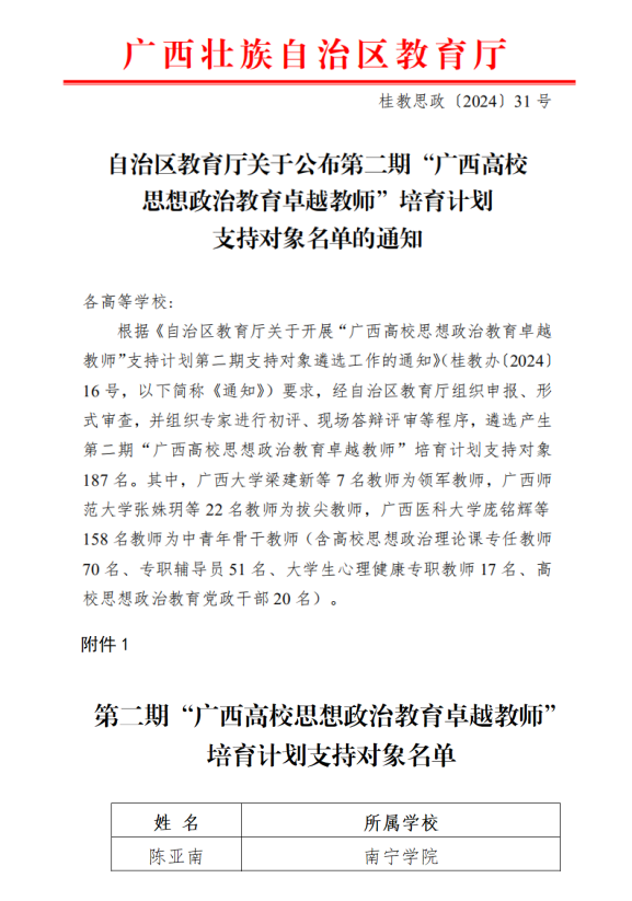 近日,自治区教育厅公布第二期“广西高校思想政治教育卓越教师”培育计划支持对象名单,我校陈亚南老师入选中青年骨干教师人选(高校思想政治理论课专任教师)。
