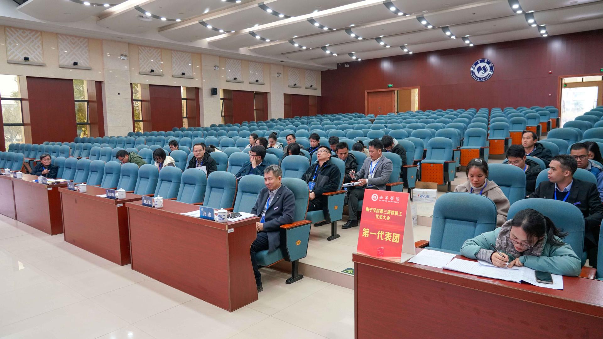 元月14日,学校召开第三届教职工代表大会暨2025年度工作会。大会由副校长龚击主持,校长李栋学,党委书记刘彪,党委副书记、副校长韦粤桂,纪委书记曹文军,副校长陈雄章、李陶深、王宁章出席大会。参加会议的还有学校教代会全体代表、列席代表、全体中层干部、教研室主任及专业负责人,七级、八级职员等。