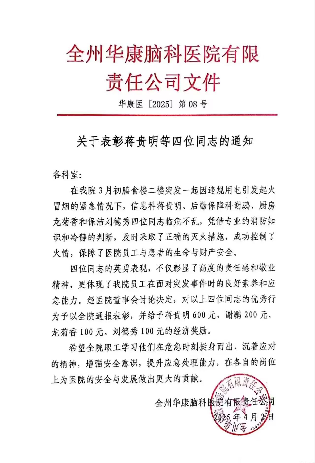 全州华康脑科医院有限责任公司表彰文件