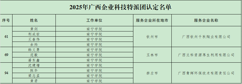 近日,根据《自治区企业科技特派员工作专班关于公布2025年广西企业科技特派员(团)认定名单的通知》(桂科发〔2025〕149号),经意向征集、双向选择、补录征集、核查确认、名单审定与公示等一系列严格程序,学校有多名教师成功获批自治区企业科技特派员(团)。