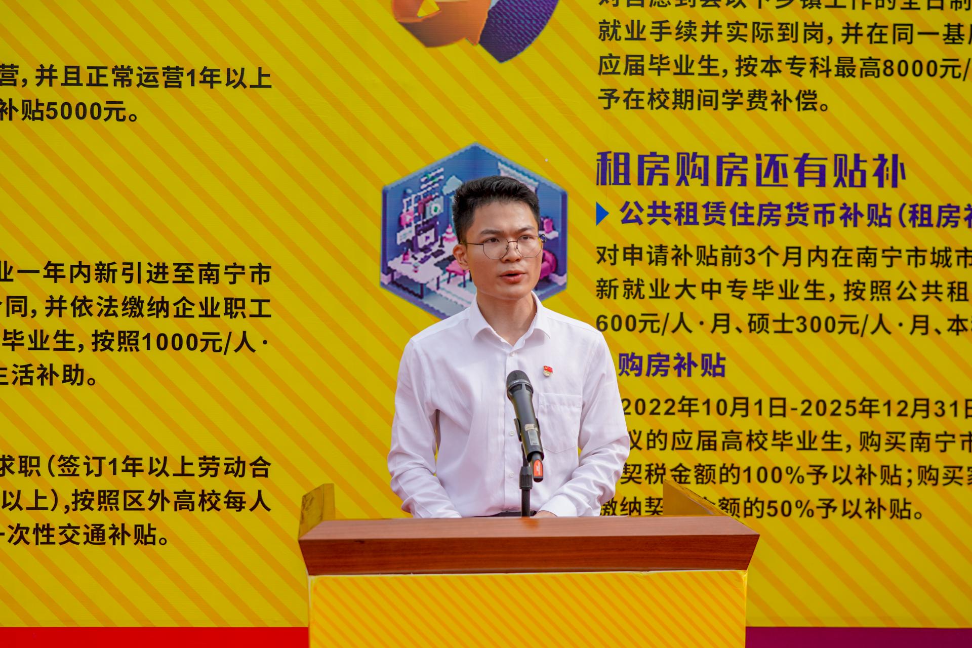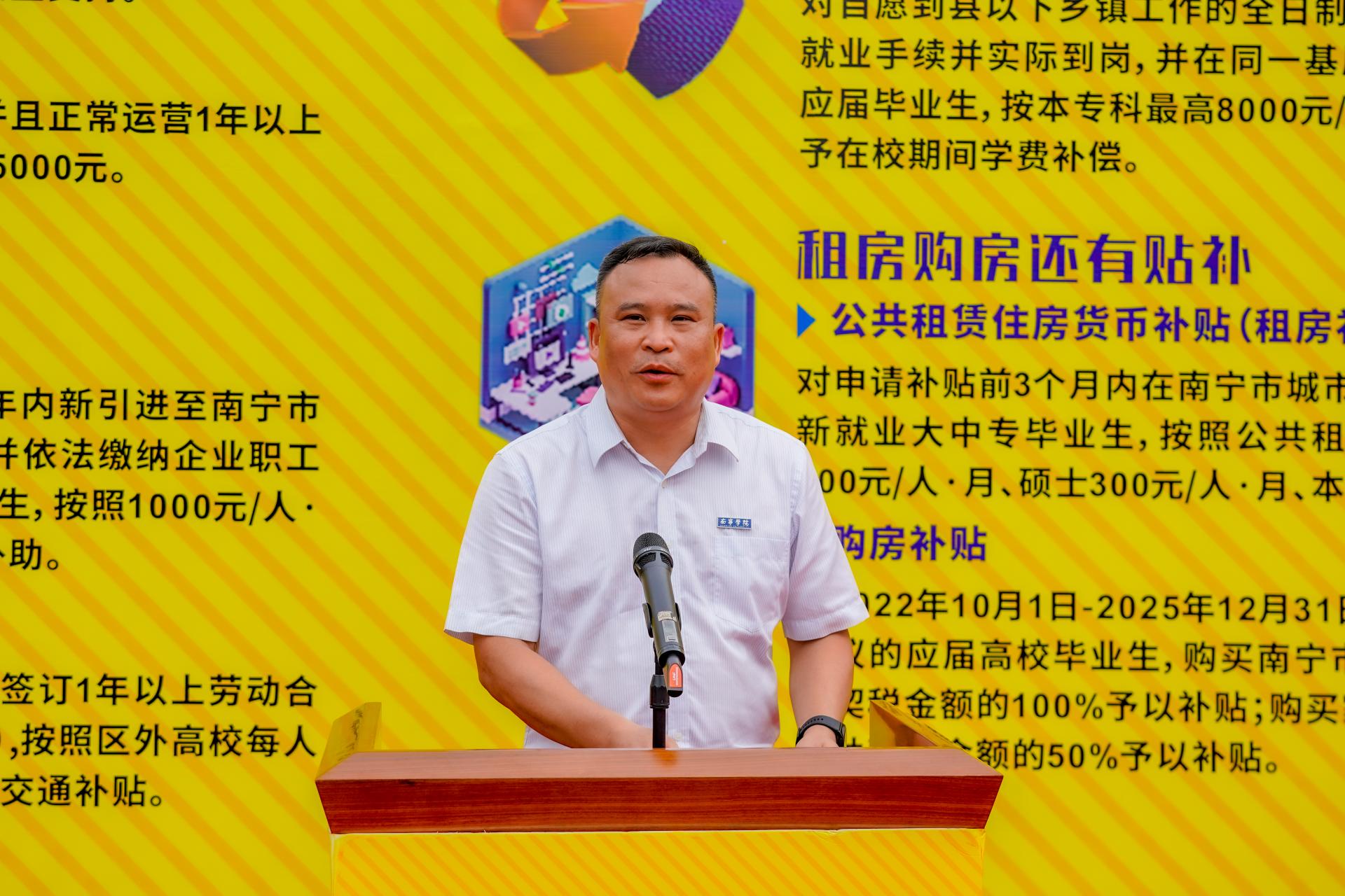 随后,学校党委副书记、副校长韦粤桂发表讲话。她强调,学校高度重视学生实习就业工作,通过定向培养、订单式实习、基地共建等模式,将实习与就业深度绑定,形成了“实习即预备就业”的良性循环。她呼吁毕业生们厚德厚学,脚踏实地,勇担社会责任;自觉自强,勤奋努力,练就过硬本领;保持初心,坚守底线,培养良好品德。并祝愿2025届毕业生都能够找到如意的工作!祝愿产教融合校企合作签约企业都能满载而归!