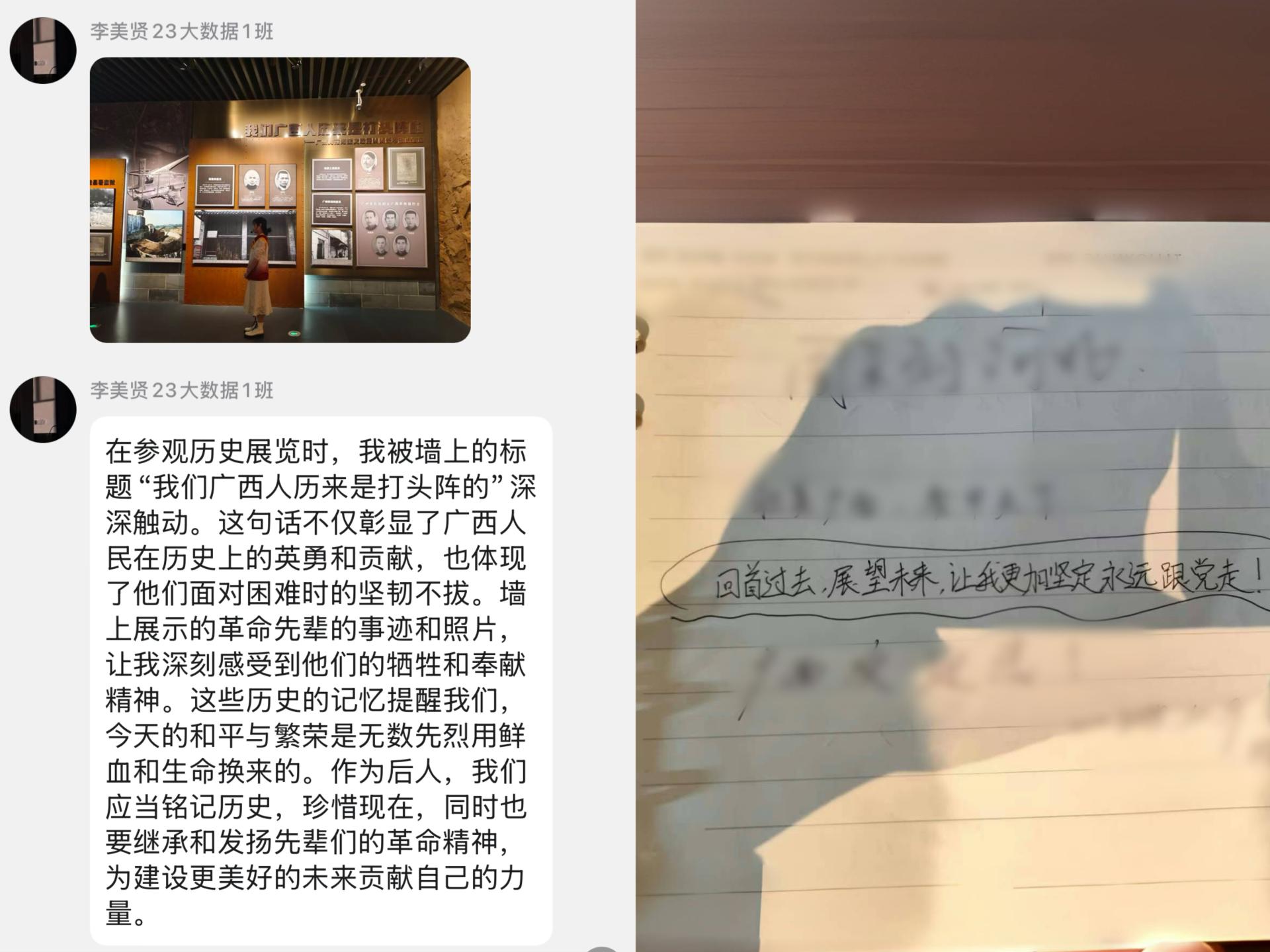 实践教学的深度,体现在学生对历史的主动思考与感悟表达中。让学生置身历史场景,通过视觉、听觉的多重冲击激发情感共鸣。参观过程中,师生围绕“广西人民的革命担当”“先辈精神的当代价值”等话题展开讨论,学生们结合自身专业与生活实际,分享对革命精神的理解。23级数据科学与大数据技术1班的李美贤同学被“我们广西人历来是打头阵的”这句展区标题深深触动,她表示:“作为广西青年,更要传承这份坚韧,用专业能力为家乡发展贡献力量。” 23级数据科学与大数据技术1班的杨宗才在展馆的留言簿上写下:“回首过去,展望未来,让我更加坚定永远跟党走!”