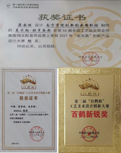 为庆祝中国共产党建党 100 周年,引导大学生了解党的奋斗历程、感悟党的初心使命,将红色元素与雕刻技艺有机融合在专业课程教学中,2021 年 1 2 月2 8 日,艺术设计学院 2019 级、2020级工艺美术专业本科示范课程《雕刻技法》、校级核心课程《玉石雕刻与开发》作品展在学校图书馆二楼中庭展厅开幕。是专业教育结合立德树人思政元素、双创融合教学改革成果。开展以能力为导向的“创新创作创造”第二实践课堂,并先后组织学生创作雕刻作品参加2018年、2023年:广西工艺美术作品展“八桂天工”、中国工艺美术“百花杯”、工艺美术金凤凰创新产品设计大赛及桂林市、贵港市、北海市、柳州市工艺美术作品展等赛事,并获得多个金、银、铜奖项,每年都有入选广西艺术作品展览,其中《脱贫心得》获2020广西艺术作品展览优秀作品奖,填补了在校大学生获此奖项的空白。体现了以能力为导向的教学成果,同时也是彰显学校应用型艺术设计人才培养的成效,更是实现“以赛促教、以赛促学、以赛促改、以赛促建”,狠抓应用型人才培养质量的成果。(艺术与设计学院供稿 文/李玟翰 图/李玟翰、陈後毅、李松霖、陈旭涌 编辑/吉定伟、覃君然)